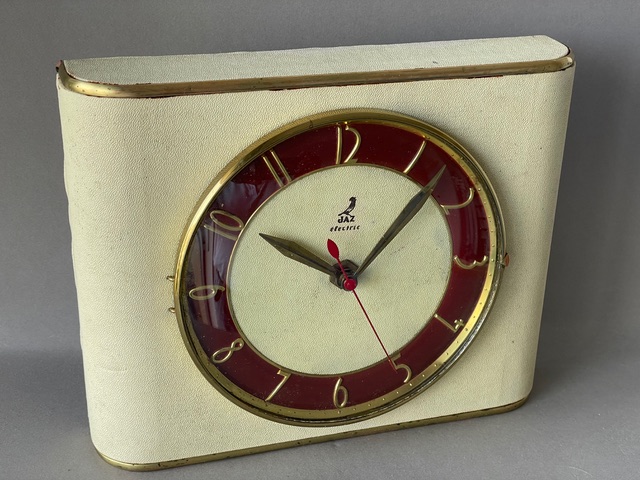 ALGIC , horloge murale , gamme Jaz Electric , mouvement à pile LR20 , calibre 1AL puis 1AN à pile LR14. Nouveauté du catalogue 1959/60 à la page 22 . Boîtier en Formica , lunette dorée , trotteuse centrale rouge vif , aiguilles dauphines . Format 23 x 22 cm, poids 575 gr sans la pile  .