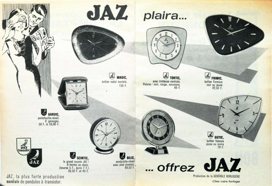 ALGIC 1848-68                                                                                                                    Au catalogue 1960/61 ce sont quatre nouvelles variantes qui sont proposées toutes dotées du calibre 2AL : Boîtier jaune , jonc noir , aiguilles brunes réf. 1848-68 . Boîtier noir , jonc jaune , chiffres jaunes , aiguilles dorées réf.1848-38 . Boîtier vert absinthe , jonc noir , chiffres et aiguilles bruns réf.1848-78 . Boîtier bleu pastel , jonc noir , chiffres et aiguilles bruns , réf 1848-88 .Consultez les nuanciers Formica pour JazalgicALGIC 1848-90                                                                                                                           Pour la dernière année de mise en vente au catalogue , à savoir  1961/62 ,  un modèle sensiblement différent est ajouté aux quatre précédentes : boîtier en Formica frêne de fil , jonc noir , cadran à filets rayonnants et chiffres bruns , aiguilles dorées pointues , réf.1848-90 .algic talic pubpublicité Paris Match 21 x 15 cm .On trouve encore l’ALGIC – dernière version- en flamme postale éditée depuis l’usine Jaz de Wintzenheim , plus de trois ans après la production de cette dernière . Petit prospectus 1960 à 1962 .