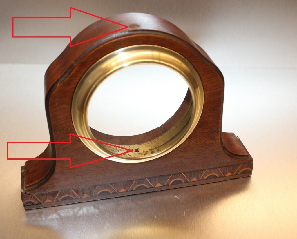 ARTIST , grand réveil-pendulette borne , mouvement mécanique , calibre 1D . Circa 1924/28 . Corps en acajou plaqué et frise en marqueterie , lunette en laiton , aiguilles scoties , vitre en verre plat , cadran émaillé ø 55 mm . Format 17 x 16 cm , poids 865 gr .