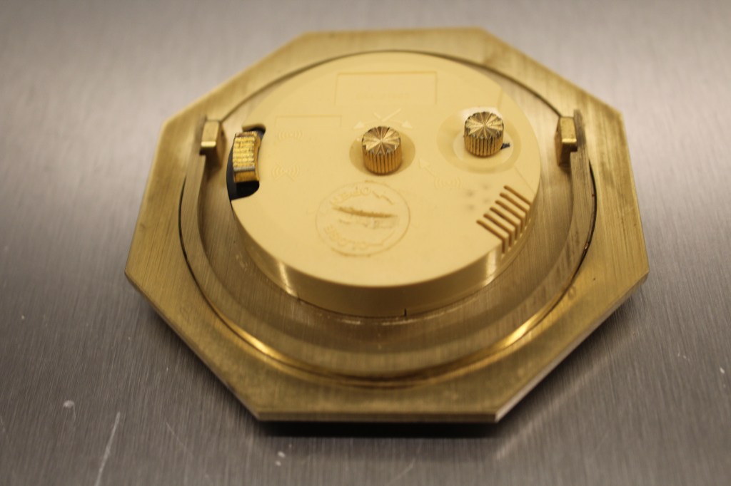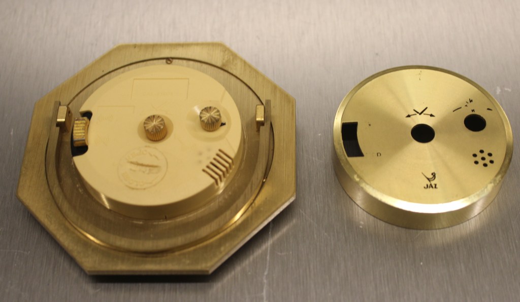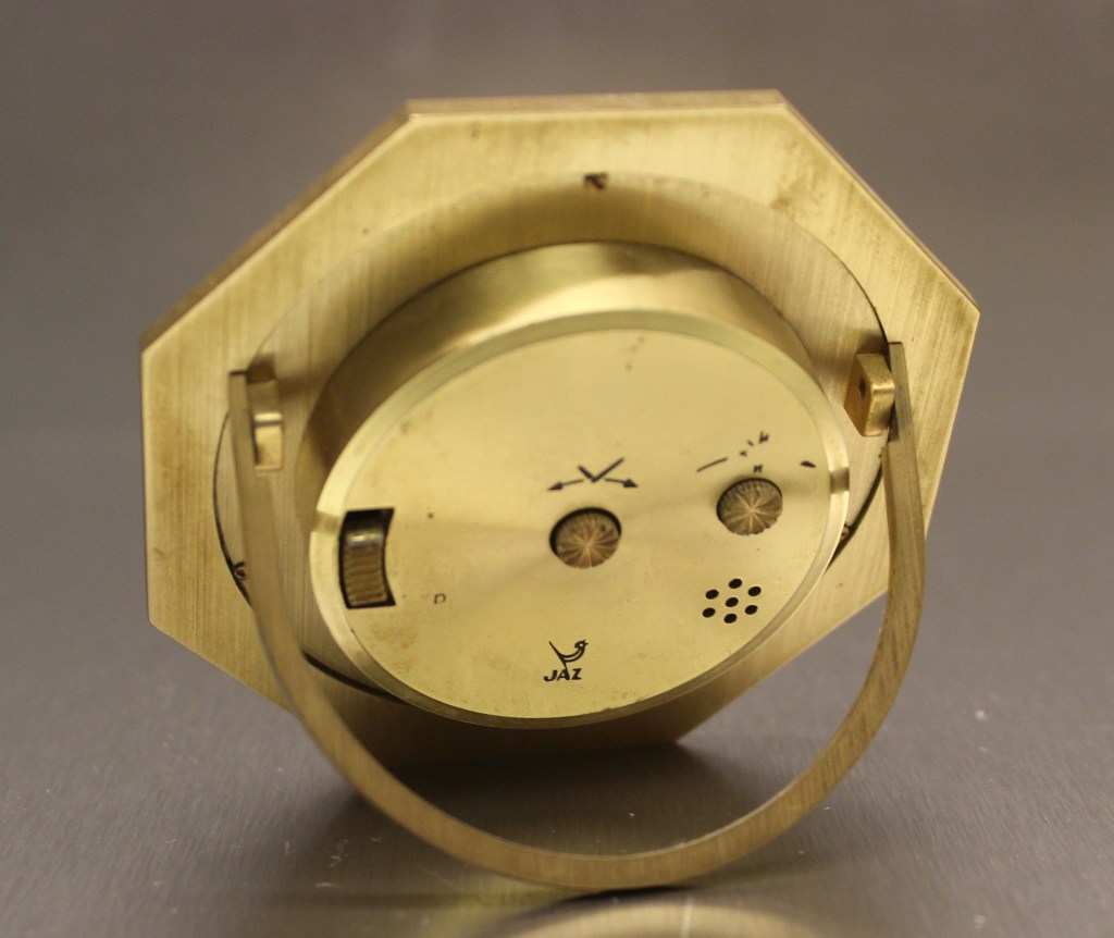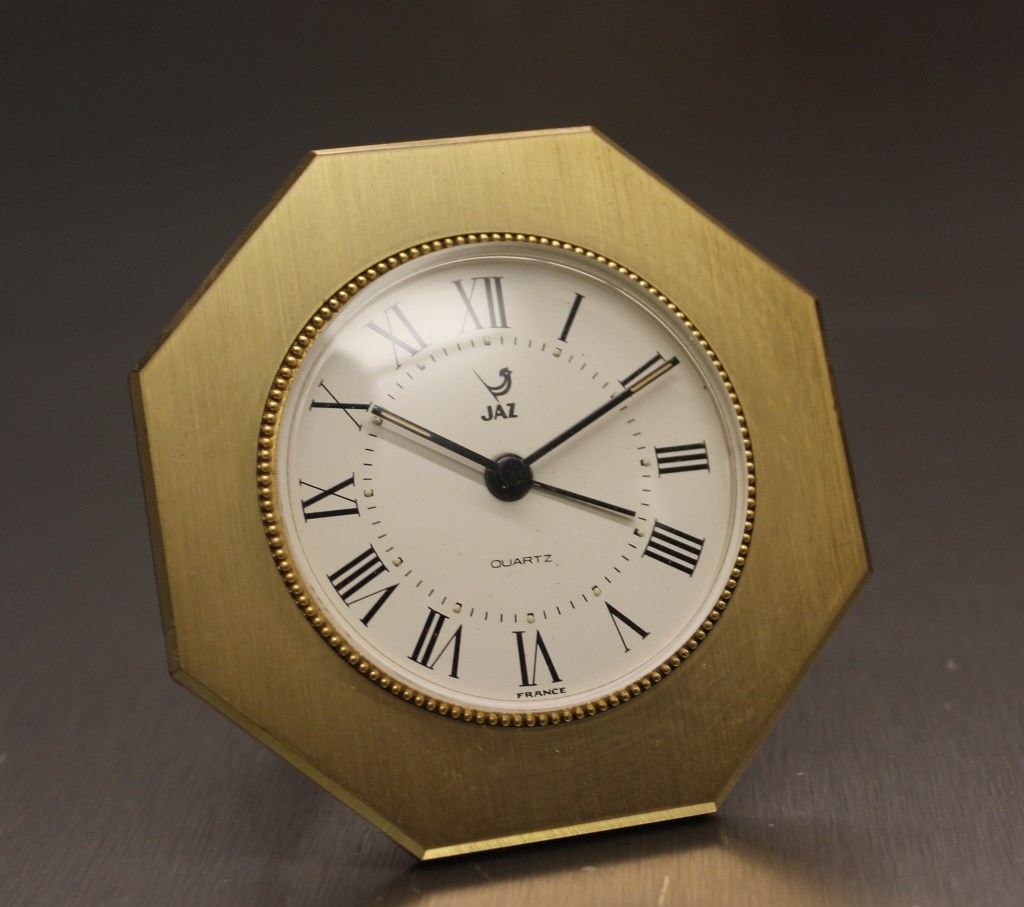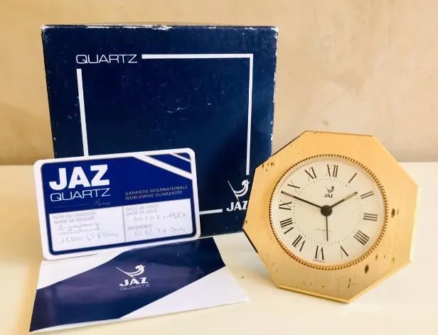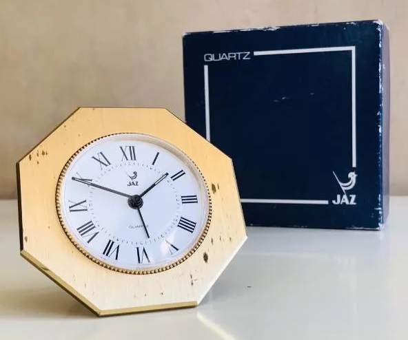 CARDIC , petit réveil quartz à affichage analogique , mouvement quartz à pile bouton LR44 , calibre 21803 . Corps octogonal en laiton massif , dos en métal , chevalet , cadran blanc , chiffres romains , aiguilles et points lumineux , 8 cm de de large et de haut , poids 180 gr . Existe en deux versions : laiton patine fusil réf.8282-21 et laiton brossé réf.8282-71 ( photo titre ) . La version 8282-21 prend la référence 5252 à la page 12 du catalogue 1985 . Si le nom de CARDIC avait déjà été attribué en 1974 à un réveil en plastique rectangulaire donc sans aucun rapport , il faut en revanche remarquer l’analogie avec les CADRIC de 1968/69 qui étaient dotés , eux aussi , d’un chevalet et d’un cadran à chiffres romains . Cette CARDIC est d’ailleurs une belle exception par sa qualité de facture , sa sobriété et le classicisme de son cadran en 1984 , année où s’accentue la décadence de Jaz .