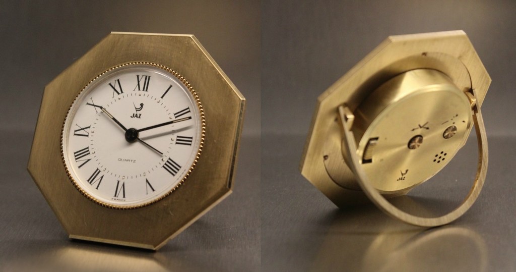 Existe en deux versions : laiton patine fusil réf. 8282-21 et laiton brossé réf.8282-71 (photo titre ) . Ce CARDIC n’est disponible qu’en 1984 . Si le nom de CARDIC avait déjà été attribué en 1974 à un réveil en plastique rectangulaire donc sans aucun rapport , il faut en revanche remarquer l’analogie avec les CADRIC de 1968/69 qui étaient dotés , eux aussi , d’un chevalet et d’un cadran à chiffres romains . Cette CARDIC est d’ailleurs une belle exception par sa qualité de facture , sa sobriété et le classicisme de son cadran en 1984 , année où s’accentue la décadence de Jaz .