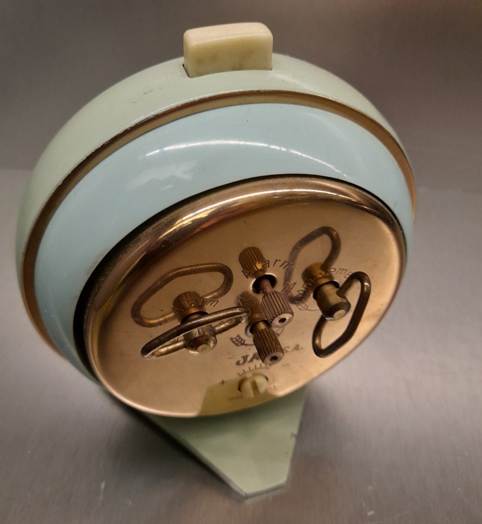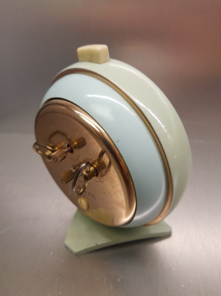 BRIDIC , grand réveil , catégorie Gros Jaz , mouvement mécanique , calibre 4U . Nouveauté du catalogue 1960/61 à la page 18 , référencée 1035-15 . Boîte crème , réserve avant , arrêt de sonnerie au sommet , bouton d’arrêt de sonnerie et pieds bronzés , cadran cuvette argent , zone des heures crème , chiffres reliefs « or » , chemin de fer rond à l’intérieur de la zone des heures , aiguilles et points lumineux , trotteuse centrale rouge , vitre bombée en verre , pieds anti-gliss , arrêt de sonnerie au sommet , mention Made n France en bas de cadran . La particularité de ce réveil est cette trotteuse centrale , option rare chez Jaz . Poids 440 gr , diamètre 9 cm , 11,5 cm de haut.