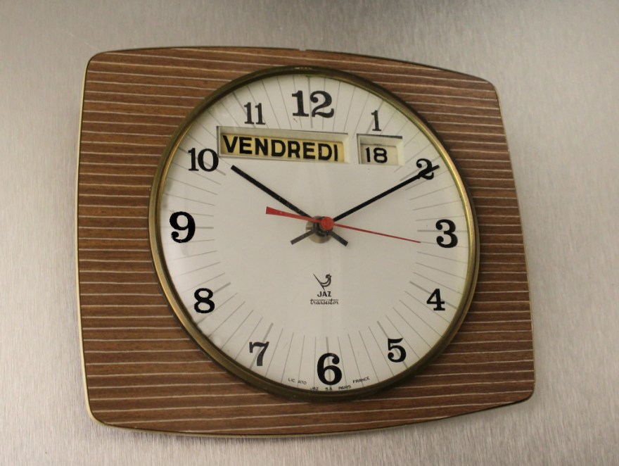 Galerie chronologique , de 1960 à 1975 , des horloges murales Jaz affichant la mention Jaz Transistor au cadran