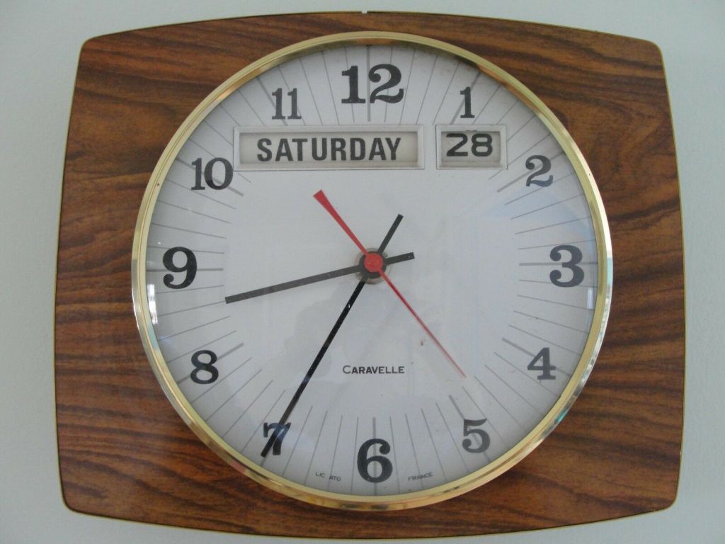 GAINIC , pendule murale de la gamme Jaz Transistor , dateur , mouvement électrique à pile LR14 , calibre CF , licence ATO. Nouveauté du catalogue 1970-1971 aux pages 24 et 25 , référencée 2715-10 . Boîtier gainé de Skaï brun et or brossé , dateur jour et date , lunette métal dorée , vitre en verre bombée , trotteuse centrale rouge  . Format 21,5 x 22,5 cm.