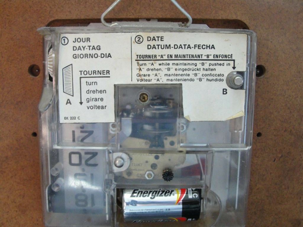 GROSSIC , pendule murale de la gamme Jaz Transistor , dateur , mouvement électrique à pile , calibre CF puis FC , licence ATO . Nouveauté du catalogue 1970-1971 à la page 24 . Format 24 x 22,5 cm , poids 910 gr sans pile .grossic profilCorps en Formica , vitre en verre bombé , dateur jour et date , trotteuse centrale rouge , jonc doré au portour . Trois couleurs disponibles : noyer de Quercy réf.2718-60 , teck de Bali réf.2718-70 ou chêne espagnol réf.2718-90 . Consultez le nuancier Formica .grossic dosGROSSIC et son calibre FC reconnaissable à ses tiges noirs de changement de jour et de date