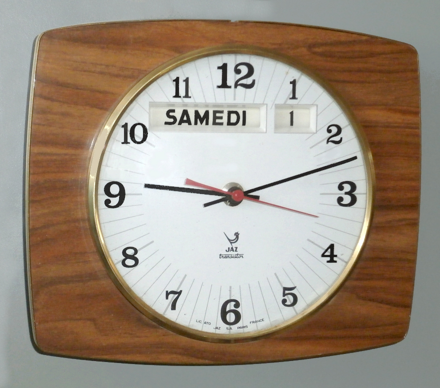 TUSSIC , pendule murale , gamme Jaz Transistor , dateur , mouvement électrique à transistor , calibre CF puis  FC à partir de 1972 ,  licence ATO . Nouveauté du catalogue 1969-1970 aux  pages 22-23 . Corps en Formica , dateur jour et date , lunette en métal doré , vitre en verre bombé , trotteuse centrale rouge . Format 23 x 20 cm , poids 775 gr.                                                                                                                                                                           Existe en quatre couleurs : Arayo et « or », finition diamant , réf. 2711-10 , ce modèle disparaît du catalogue 1971-1972 . Noir , réf. 2711-30 , ce modèle disparaît du catalogue 1972-1973 .  3 Noyer de Quercy , réf. 2711-60 . 4 Acajou rouge ,réf. 2711-90.                                                                                                                                                                                   La TUSSIC  n’est plus au catalogue en 1976 , elle était la déclinaison avec dateur de la TONNIC .tussic dos (2)TUSSIC dos et son calibre CFTussic pub 1970 illPublicité extraite du journal Tintin (au verso la BD de S.F. Luc Orient par Eddy Paape) 1970 format 27,5 x 11 cm . Journal de Tintin oblige , Jaz tutoie le lecteur ( chez ton horloger)  à l’occasion de la fête des mères qui était chaque année une de ces trois campagnes principales de réclames avec Noël et les communions solennelles . On notera que la date et le jour sur une horloge murale sont d’une telle nouveauté que l’on se doit encore de l’expliquer . Effectivement c’est une PREMIERE MONDIALE pour Jaz en 1967 : ce calibre CF , qui équipe ses premières horloges à dateur , est le 1° mouvement au monde à pile indiquant heure , seconde , jour et date .