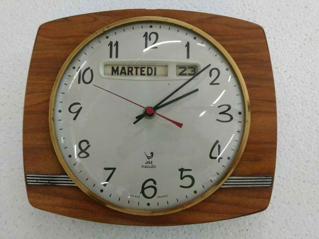 JOIGNIC , pendule murale , d’abord de la gamme Jaz Transistor puis Jaz Quartz , dateur , mouvement électrique à pile , calibre CF puis FC , TJ et JK , licence ATO . Nouveauté du catalogue 1970/71 à la  page 24 .  Boîtier en stratifié type Formica par  Polyrey ; décors façon or brossé ; guichets blancs ; chiffres et dates noirs , aiguilles noires , trotteuse centrale noire . Format 27,5 x 23,5 cm.