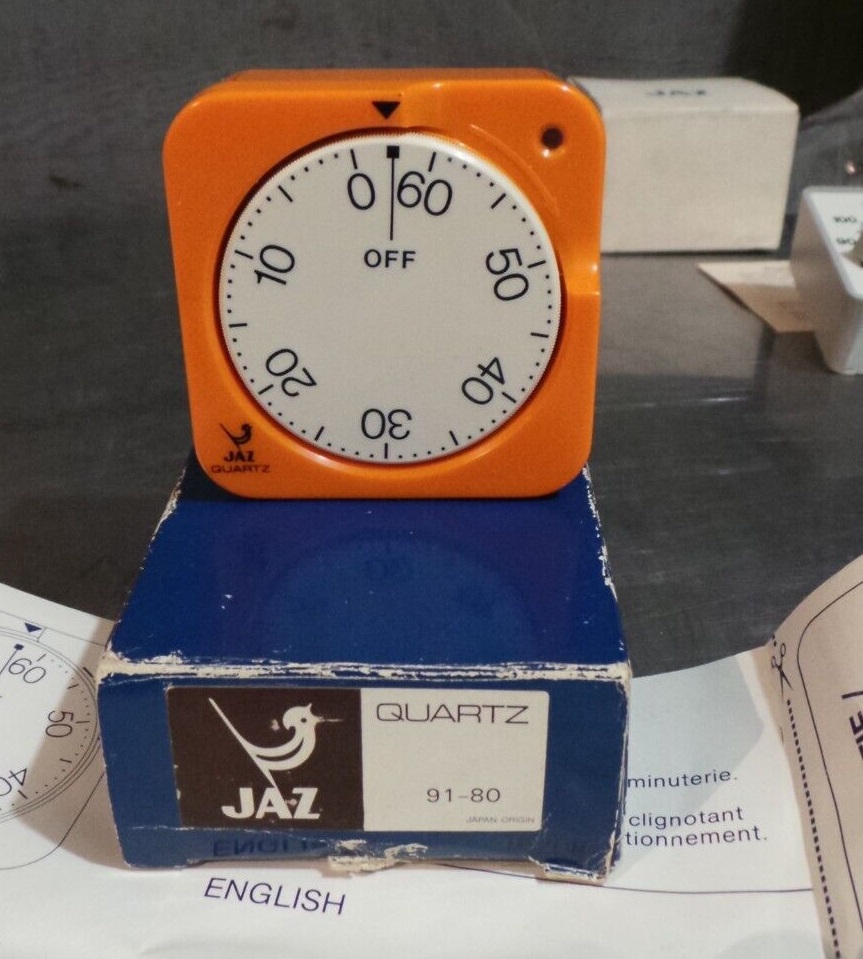 SUGIC , compte-minutes 60 minutes , mouvement à quartz , calibre CMK , made in Japan . Nouveauté du catalogue 1982-83 à la page 20 , référencée 91-10 . Boîtier blanc et cadran noir. Format 6,2 x 6,2 x 3 cm , poids 70 gr sans la pile LR6 . Dès août 1983 apparaît une variante orange référencée 91-80. En 1985, il porte les références 2003 et 2004 . En 1986, pour sa dernière année de mise en vente, seul le modèle orange 2004 est encore disponible. Made in Japan.