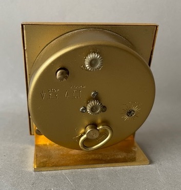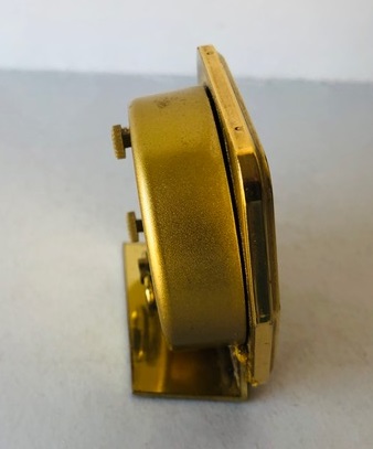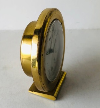 3001. Petit réveil mécanique rond en laiton sur socle cunéiforme, pas de chiffres mais des index, arrêt de sonnerie au dos, mouvement mécanique , calibre CS, apparaît uniquement dans les nouveautés du catalogue 1985. Diamètre 5 cm.