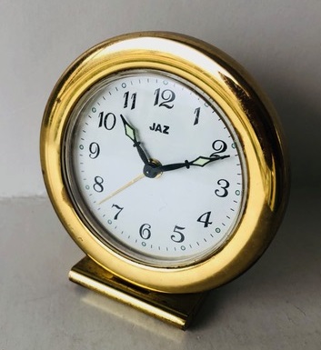3040. Petit réveil rond sur socle , à corps en métal doré, mouvement mécanique, calibre CS à clef unique de remontage, aiguilles lumineuses. Nouveauté du catalogue 1991/92 en page 13, présent jusqu’en 1995. Diamètre 6,3 cm