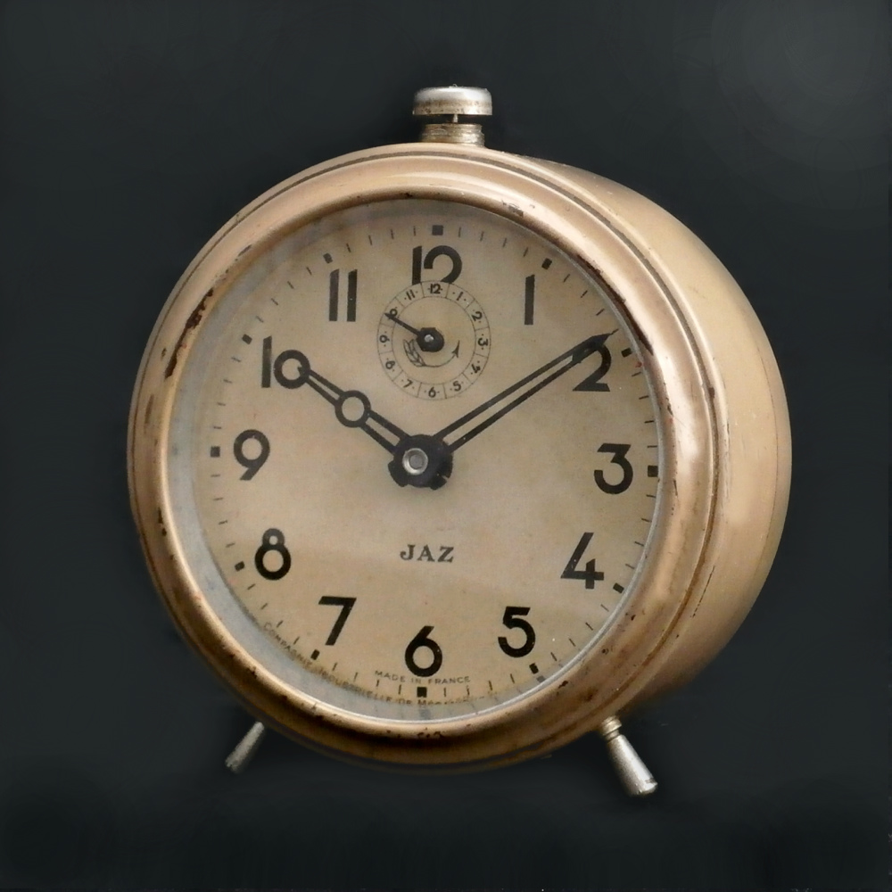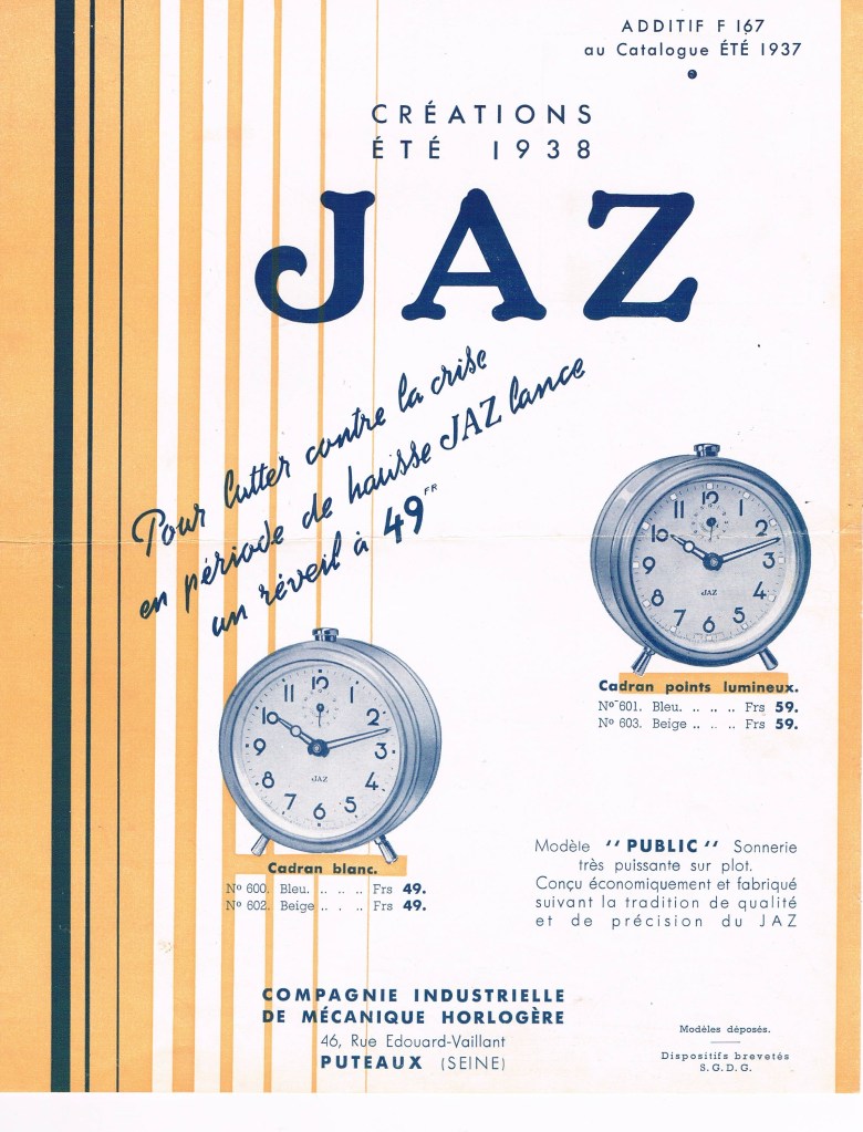 PUBLIC, réveil de la gamme des Gros Jaz, mouvement mécanique calibre D , avec ou sans bélière, vitre en verre plat, mentions Made in France et Compagnie Industrielle de Mécanique Horlogère en bas de cadran, aiguilles noires, aiguille de l’heure pontife, aiguille des minutes glaive. Boîtier en métal émaillé en couleur, arrêt de sonnerie au sommet . Diamètre 9,5 cm, poids 390 gr ( si bélière) .