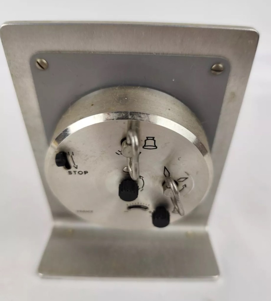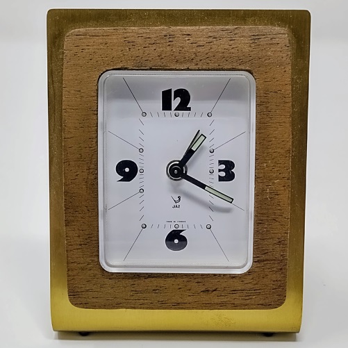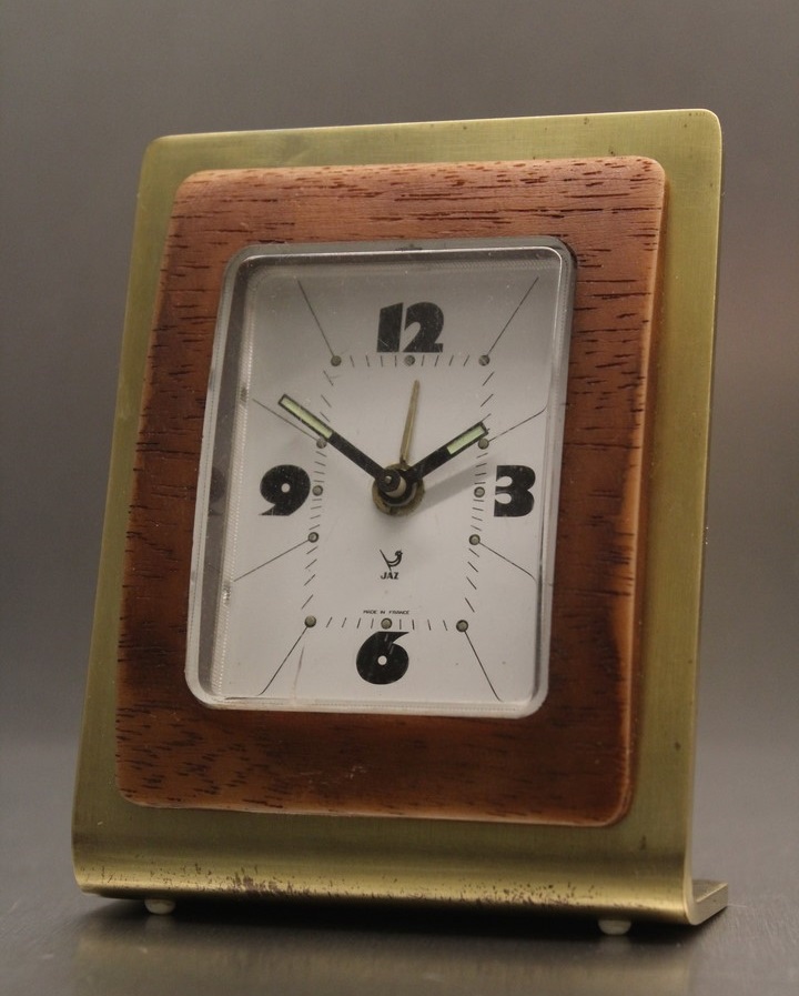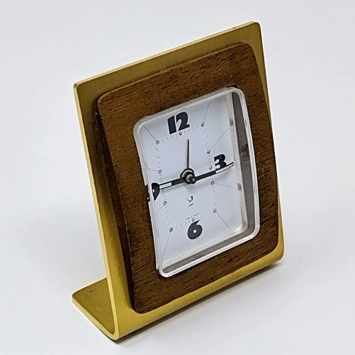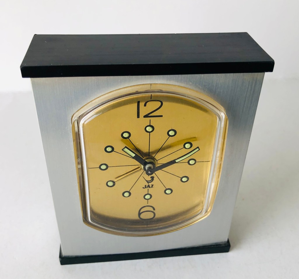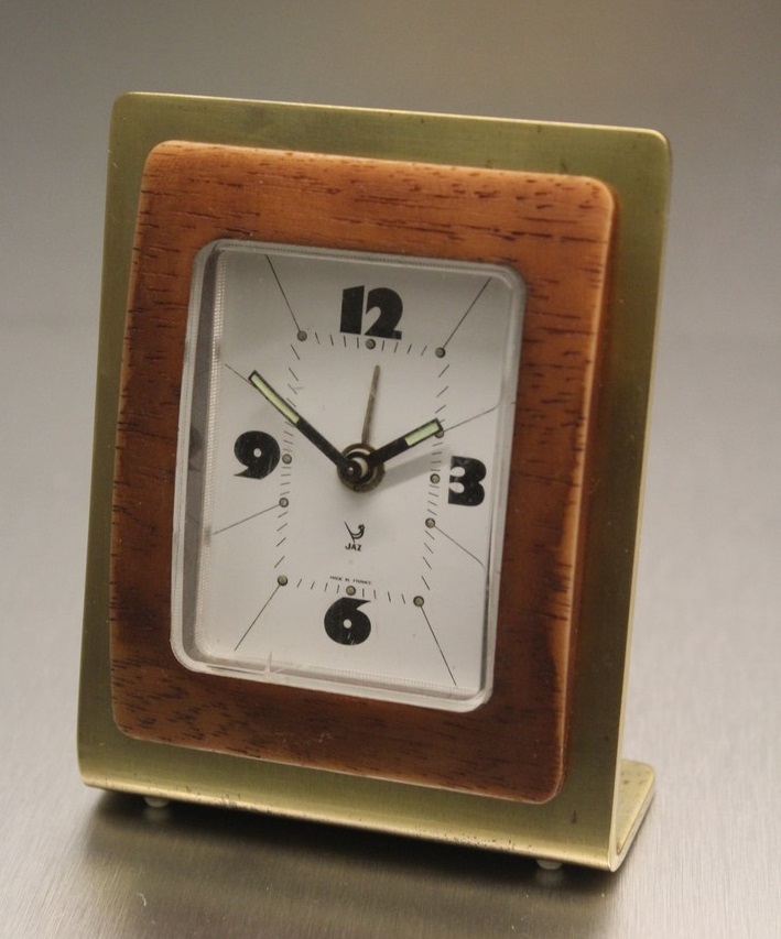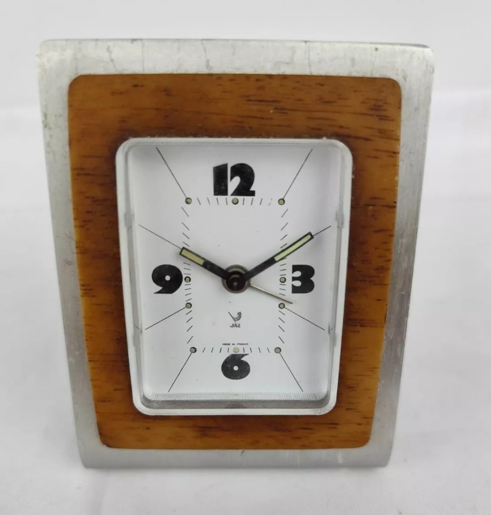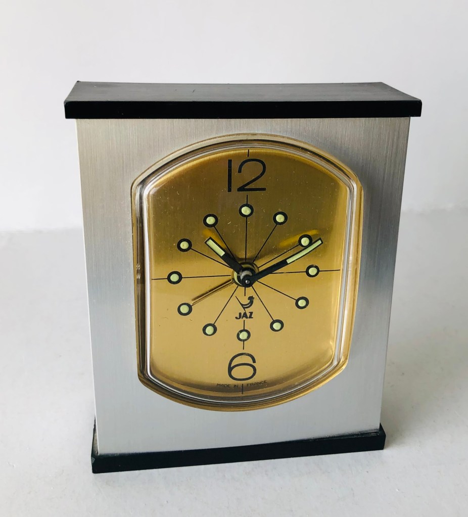 POPIC , petit réveil , mouvement mécanique , calibre DK , arrêt de sonnerie au sommet, bouton d’arrêt luminescent . Réservé à l’exportation , disponible dans le catalogue 1976 export à la page 42 . Boîtier et socle en métal , vitre en plexiglas , aiguilles et points lumineux . Format 6,2 x 7 cm, poids 144 gr .
