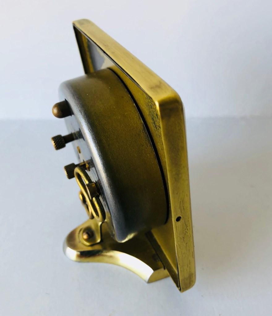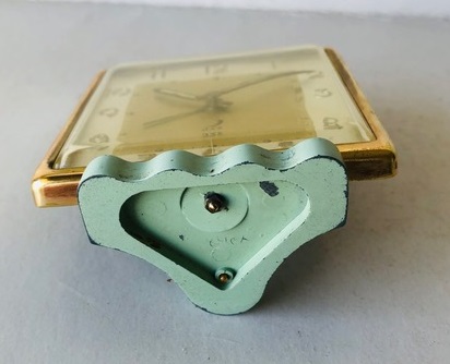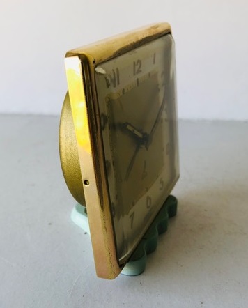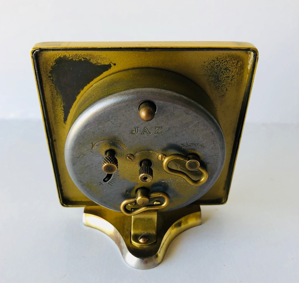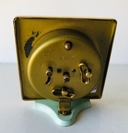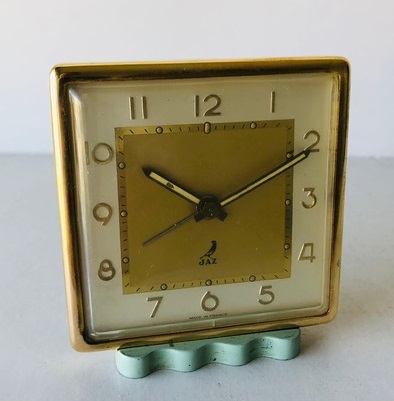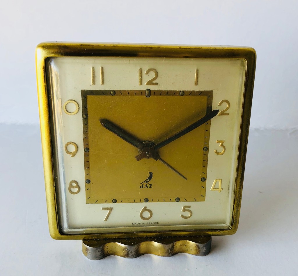 TORPIC , petit réveil , gamme des Stylites , mouvement mécanique , calibre 6J . Référencé n° 467-15 à la page 9 du catalogue Jaz de 1955 . Corps en métal doré , réserve avant et pieds torpilles cuivrés , cadran argenté , chiffres arabes en relief , aiguilles et points lumineux , existe également en modèle à chiffres romains avec boîtier laqué écaille acajou rouge dès 1955 et l’on pouvait déjà opter pour un modèle à chiffres arabes avec un corps et une cloche couleur ivoire avec au choix une version non lumineuse 467-14 ou lumineuse n° 467-15 lesquelles ne durent que l’année 1955 , remplacées dès 1956 par le modèle ci-dessus à boîtier « or « version lumineuse uniquement .