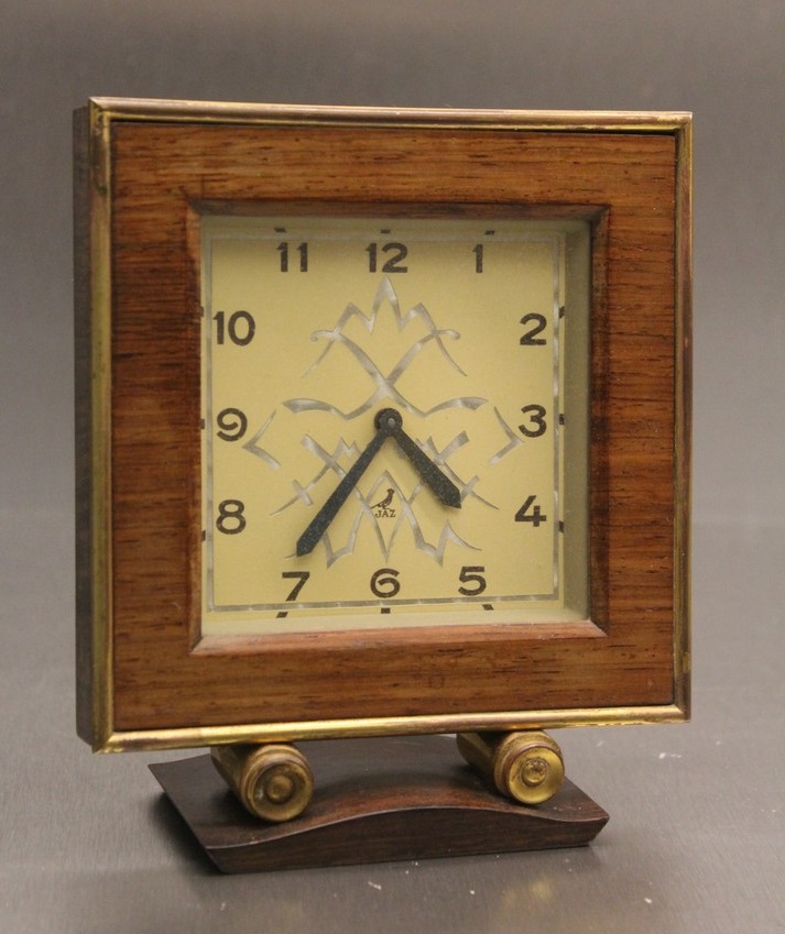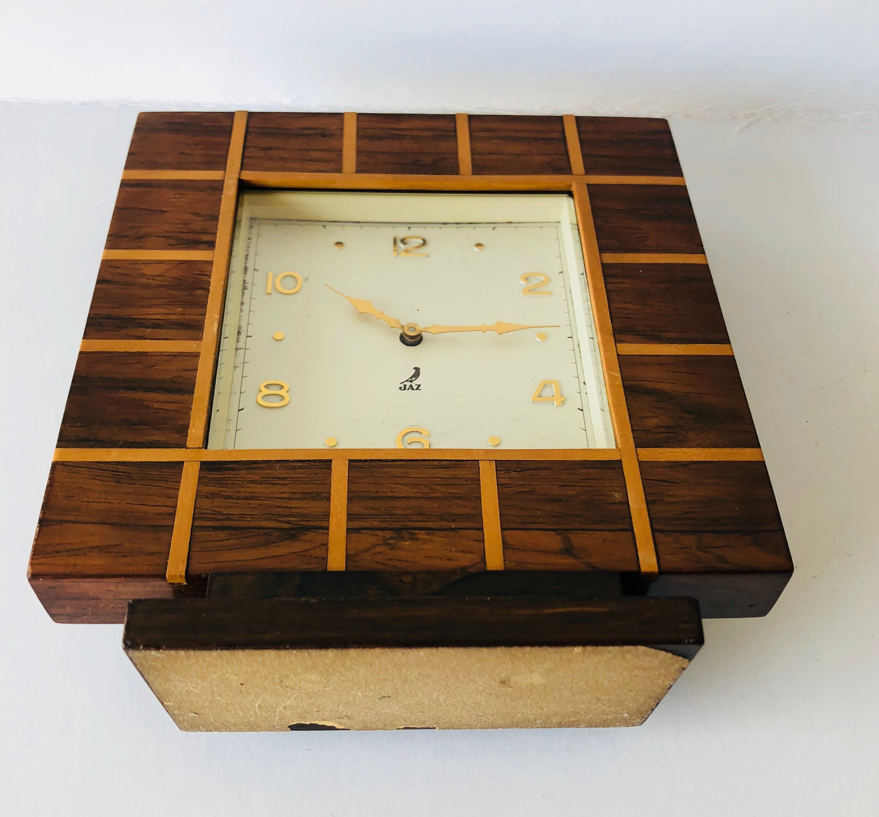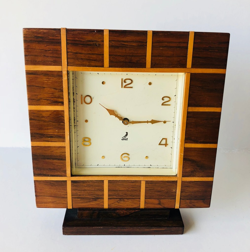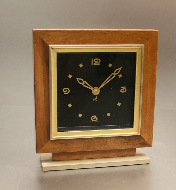 Boîtier et socle en ébène et macassar , encadrement et intermédiaire de socle en métal doré , vitre en verre plat , cadran métal ivoire , chiffres bruns , arabesques découpées , aiguilles glaives , entièrement exécuté à la main , non-lumineux . Format 12 x 14,5 cm, poids 485 gr . La FONCIC n’est plus disponible en 1952 .