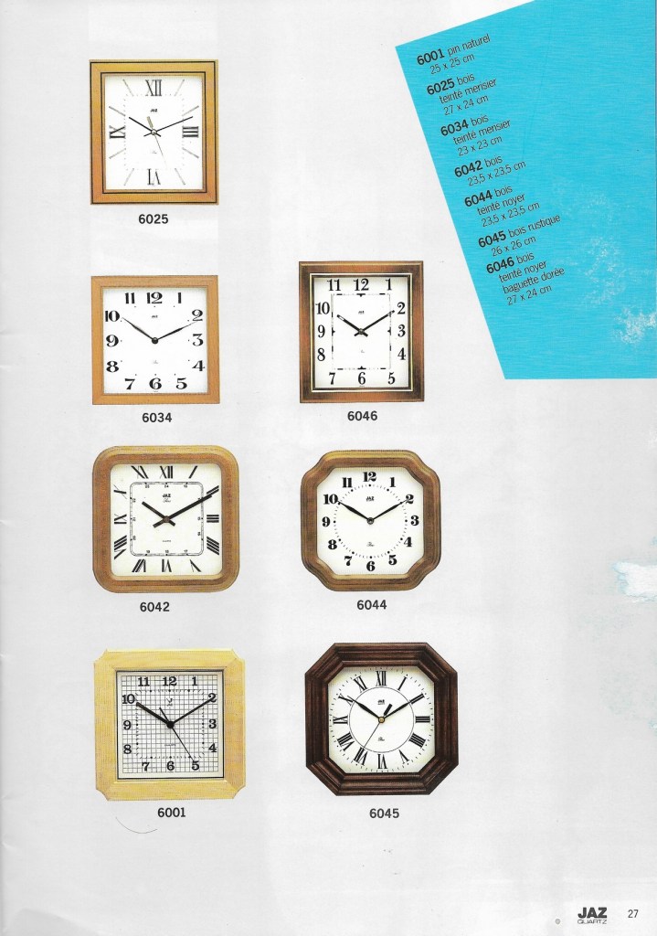 6042 , horloge murale , gamme Jaz Paris , corps en bois , chemin de fer à l’intérieur de la zone des chiffres , chiffres romains sur cadran blanc , aiguilles noires , calibre MAK , mouvement quartz à pile LR6 , format 23,5 x 23,5 cm , présente uniquement au catalogue 1986 page 27 .