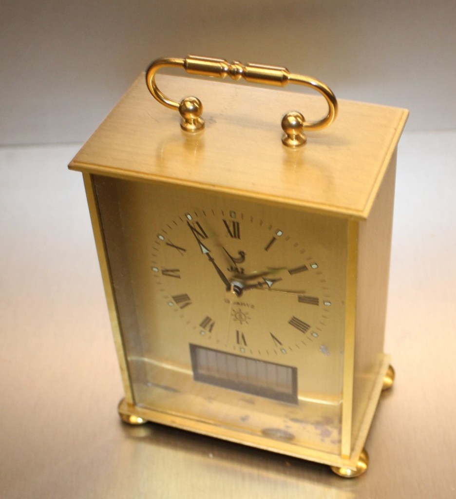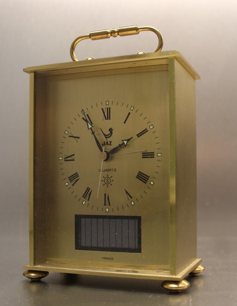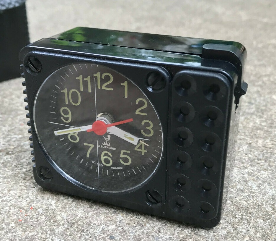 Boîtier en laiton strié , cadran noir , aiguilles et points lumineux , pas de chiffres mais des index en relief . Format 6 x 7 cm , poids 285 gr ( le format est petit mais son boîtier en laiton massif lui confère un poids important ) . Très proche de son voisin de catalogue le