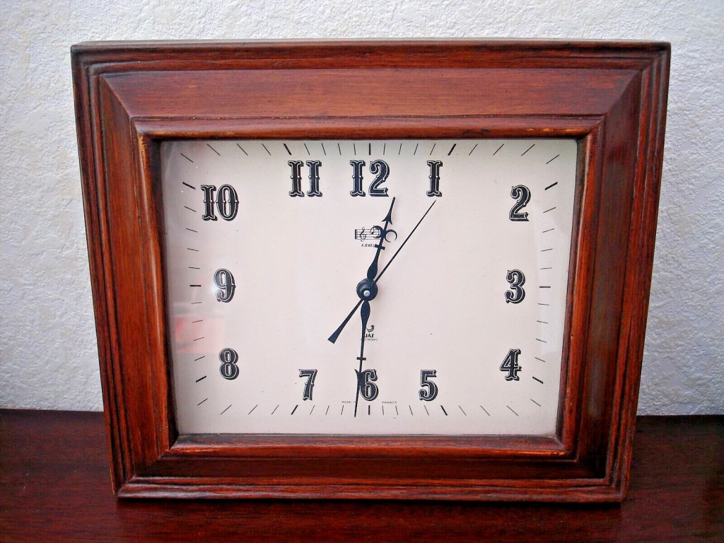 RHONIC , pendule murale , gamme Jaz Electronic , calibre SH à sonnerie heure et demi-heure , mouvement made in Japan mais horloge assemblée en France . Boîtier résine façon bois , cadran blanc , aiguilles et chiffres noirs Western , trotteuse centrale , vitre en verre plat . Format 30,5 x 26 cm . Nouveauté du catalogue 1975 à la page 21, référencée 3207-10 . Le nom de RHONIC avait déjà été attribué à une horloge en forme d’assiette dans les années 50 . Sous le 12 une petite portée ornée d’une clé de Sol et de deux notes correspondantes aux deux tons choisis : Do et Sol indique qu’elle est doté d’un carillon . Calibre SH made in Japan . Dernière apparition au catalogue 1982 .
