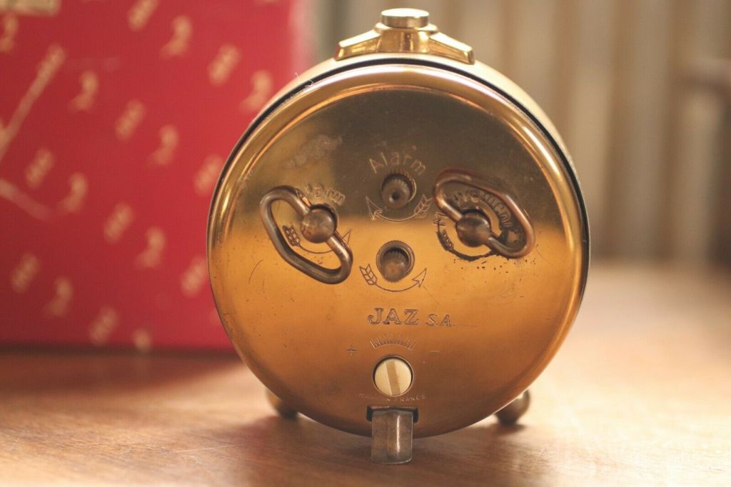 Sous les flèches verticales ces patins en caoutchouc blanc font office de pieds antigliss ; au bout de la flèche à l’horizontale on voit l’inscription ciselée par l’horloger avec une pointe sèche ; Elle pourrait étonné puisque 1/7/61 , pour le premier Juillet 1961, semble une date bien précoce pour une révision d’un réveil sorti au plus tôt en Juillet 1960 , puisque c’était l’usage de les graver sur une partie cachée du réveil . Mais certains horlogers notaient également la date de vente selon le même procédé .