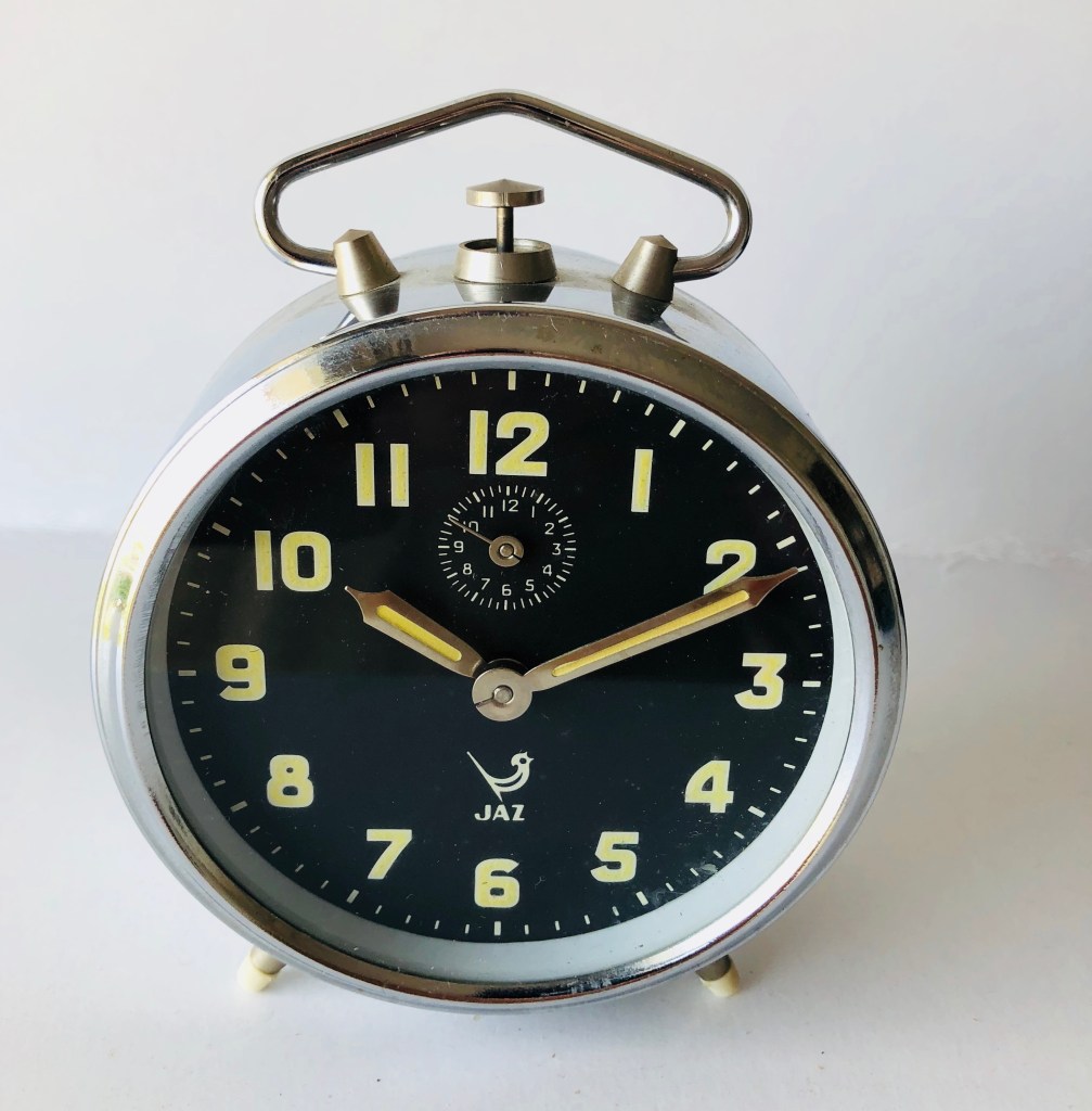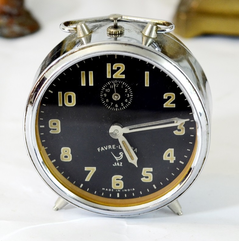 Réveil , mouvement mécanique , calibre 1U , mention made in India en bas de cadran , daté 1978 en creux sur la platine . Corps en métal chromé , bélière triangulaire , réserve en plastique , vitre en verre plat , cadran noir , aiguilles et chiffres lumineux , pieds antigliss , cadran noir . Diamètre 9,5 cm , poids 450 gr .