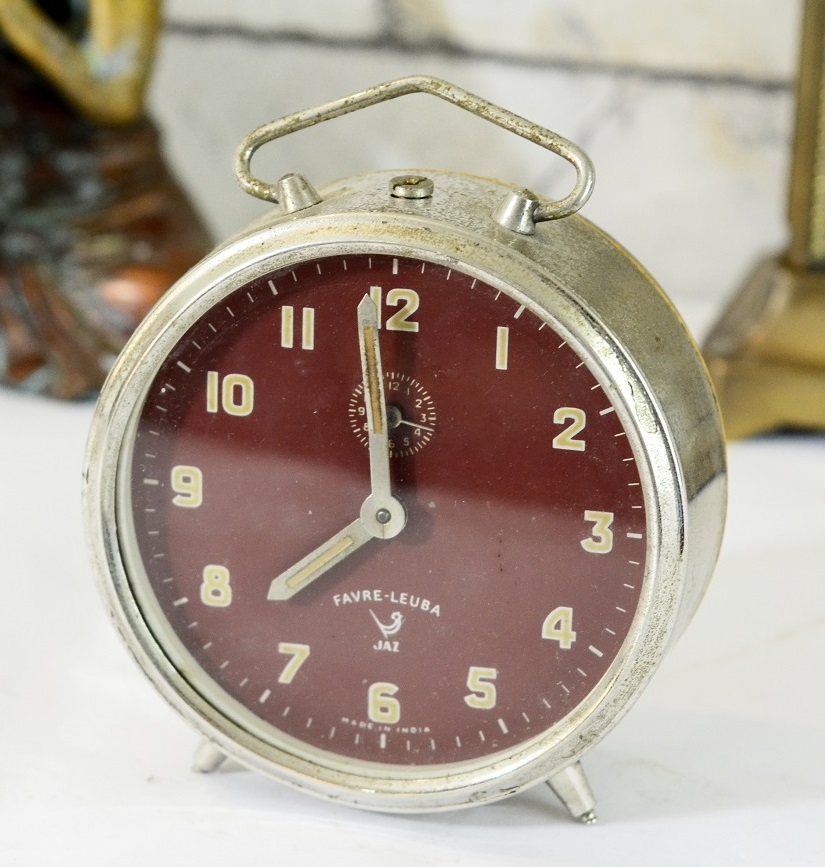 La production indienne de Favre- Leuba Jaz , via la SIFCO , semble se cantonner à des gros réveils ronds très classiques , hormis parfois des petits personnages animés disposé à 7 heures comme pour un LEVRIC ou un BABIC . On reconnaît un CHILIC avec sa bélière en triangle pointu et son jaseur à queue basse : il s’agit donc un modèle d’importation qui n’est pas Made in India , comme l’indique fièrement au cadran les productions sorties de l’usine de la province de l’ Andhra Pradesh . Consultez notre article consacré réveil Jaz Favre Leuba géant offert au Raja de Nanpara