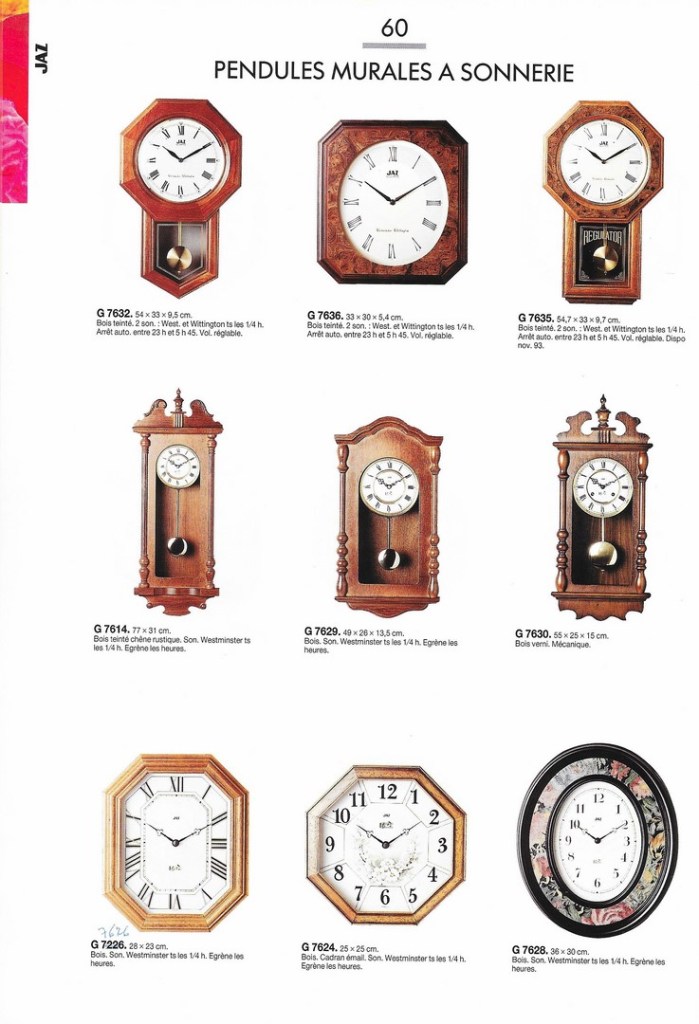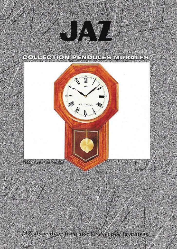 7632 , horloge murale , gamme Jaz Quartz , à piles , carillon à deux sonneries Westminster ou Wittington tous les quarts d’heures , arrêt automatique entre 23 h et 5h 45 , volume réglable , balancier , chiffres romains sur cadran rond , corps en chêne massif , aiguilles feuilles noires , format 54 x 33 x 9,5cm ( au catalogue 1992 le format indiqué est 48,5 x 29 x 7,5 cm ). Nouveauté du catalogue 1992 , puis référencée G7632 dans les catalogues 1993/1994 et 1994/1995