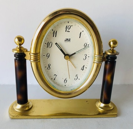 5426 réveil portique à colonnes façon écaille , gamme Jaz Quartz à pile LR6 , chiffres Breguet sur cadran ovale , trotteuse centrale dorée, nouveauté du catalogue 1994/95 jusqu’à l’année 2000. Format 13,5 x 15 x 4,2 cm Poids: 638gr.