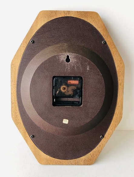 6043 horloge octogonale en bois, gamme Jaz Paris, mouvement quartz à pile LR6, chiffres Breguet, aiguilles feuilles noires, nouveauté du catalogue 1986 page 26 présent aux catalogues jusqu’en 1988