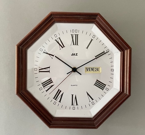 7219 horloge murale, à dateur date et jour, mouvement quartz à pile LR6, chiffres romains sur cadran émaillé, trotteuse centrale noire, forme octogonale en bois composite façon noyer de couleur brune et non pas noir contrairement à la photo du catalogue, présente uniquement au catalogue 1993/94 à la page 59. Format: 25 x 25 cm.