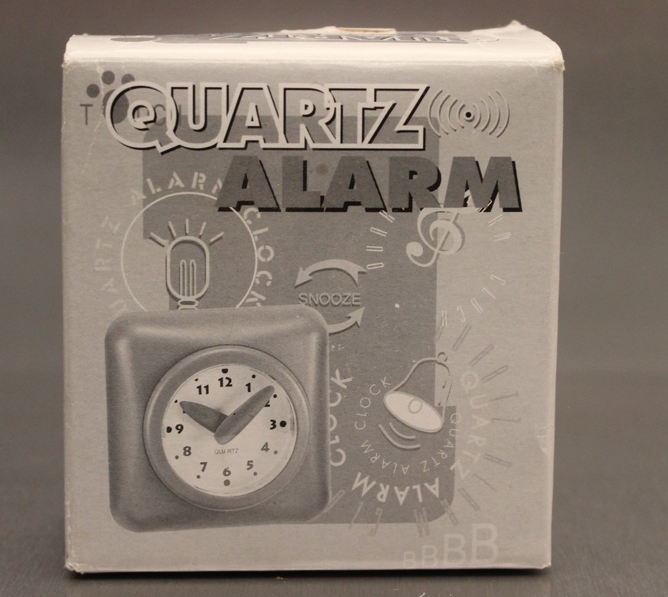 G5405 , petit réveil , mouvement à quartz , corps en plastique gris , aiguilles lumineuses , trotteuse centrale rouge , forme carrée 7,5 x 7,5 cm , poids 70 gr sans la pile LR03 , finger touch = arrêt de sonnerie par contact avec le doigt sur la vitre en plastique , allumage du cadran par pression sur la vitre , sonnerie progressive crescendo .