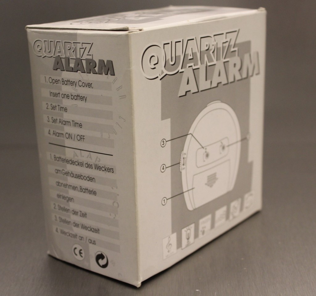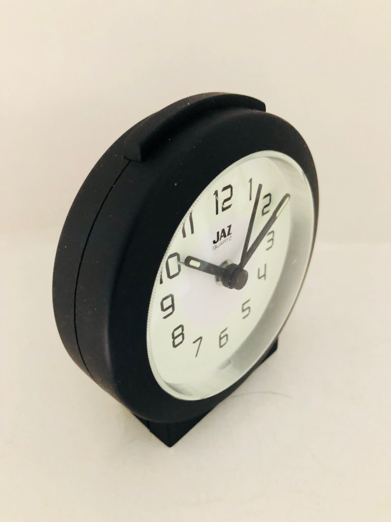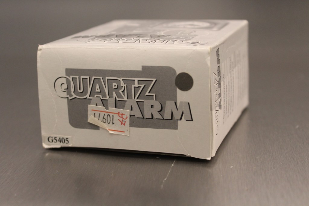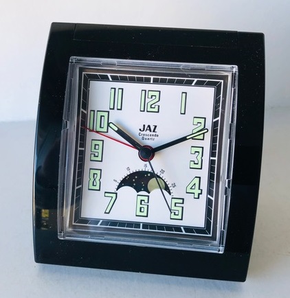 G4522 , réveil , corps en plastique noir , cadran Lumibrite , mouvement quartz à pile LR6 , à répétition de sonnerie et sonnerie progressive type Crescendo , éclairage du cadran , arrêt de sonnerie au sommet , trotteuse centrale noire , aiguilles en plastique noir , aiguilles et cadran lumineux , présent uniquement au catalogue 2000 page 14 , format 8 x 8 x 3,5 cm . Voir la version bleu marine .