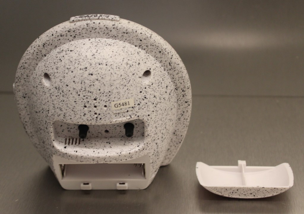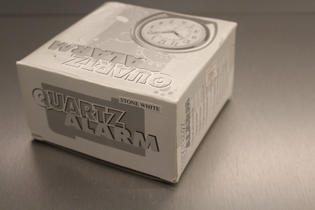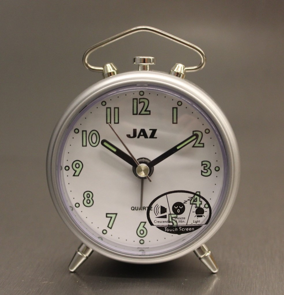 G5481 , grand réveil , corps en plastique gris moucheté , pile LR6 , quartz , arrêt de sonnerie au sommet , trotteuse centrale rouge , aiguilles lumineuses , hauteur 12 cm ,poids 130 gr, finger touch = arrêt de sonnerie par contact avec le doigt sur la vitre en plastique , allumage du cadran par pression sur la vitre , sonnerie progressive crescendo et répétition de sonnerie