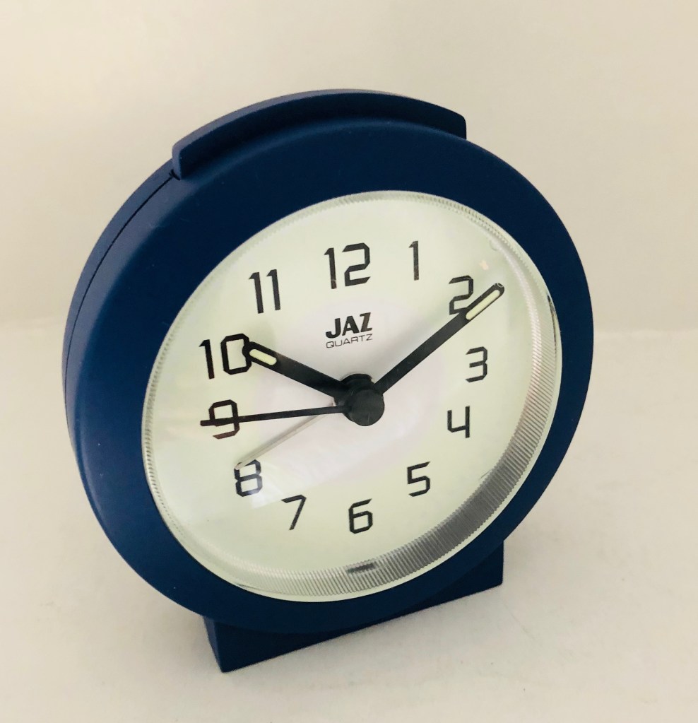 G4523 , réveil , corps en plastique bleu marine , cadran Lumibrite , mouvement quartz à pile LR6 , à répétition de sonnerie et sonnerie progressive type Crescendo , éclairage du cadran , arrêt de sonnerie au sommet , trotteuse centrale noire , aiguilles en plastique noir , aiguilles et cadran lumineux , présent uniquement au catalogue 2000 page 14 , format 8 x 8 x 3,5 cm . voir la version noire .