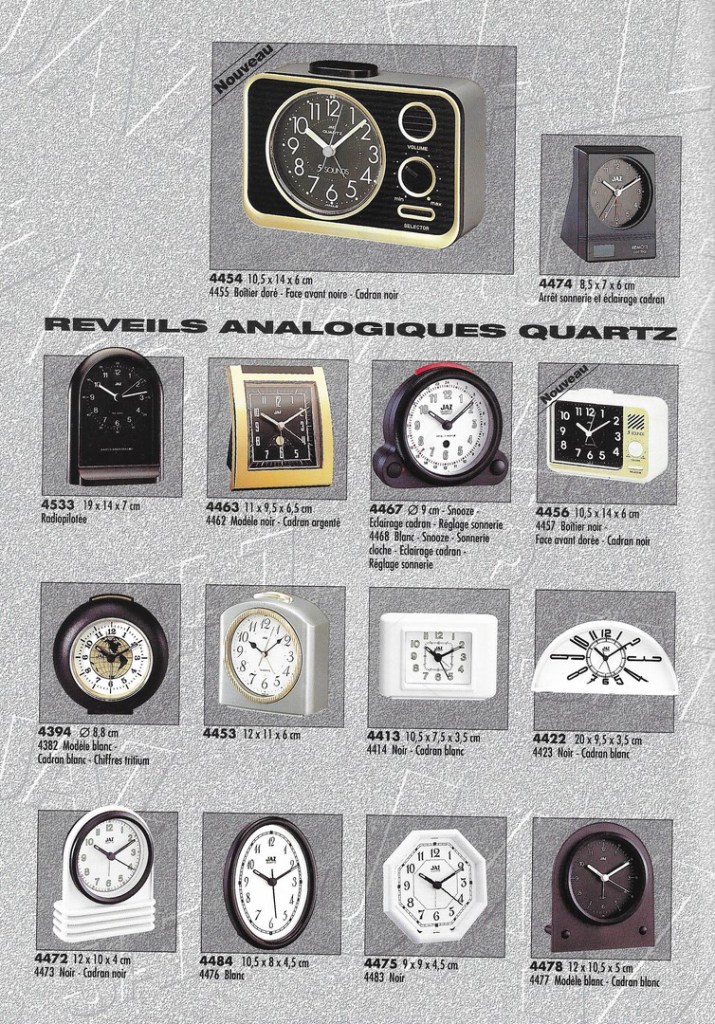 4462 / 4463 , réveil corps en plastique 4462 coque noire, cadran blanc, quantième de lune , aiguilles et chiffres lumineux , trotteuse centrale rouge, sonnerie crescendo , quartz à pile LR6, 11 x 9,5 x 6,5 cm , poids: 125 gr. Nouveauté du catalogue 1991 page 8 ,complété en 1992 par le modèle doré réf: 4463 disponibles jusqu’en 1994.