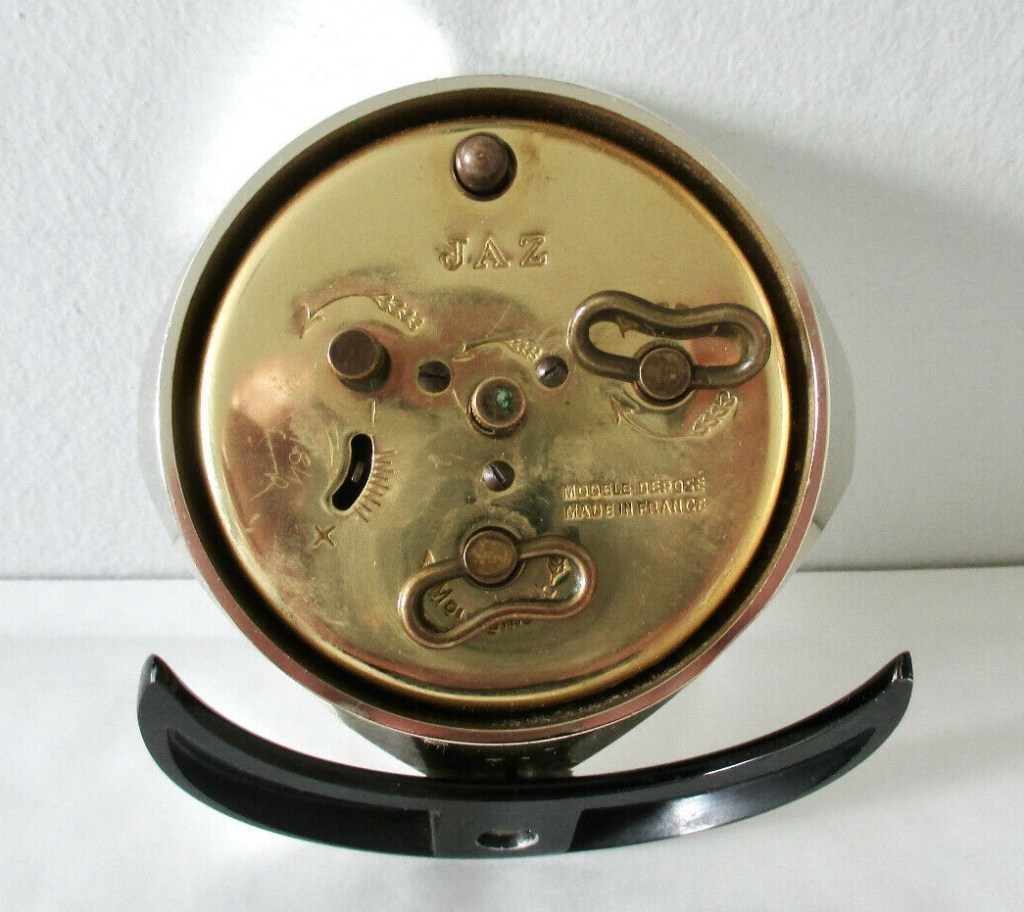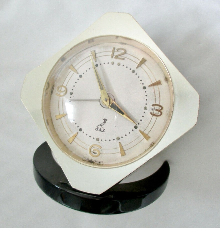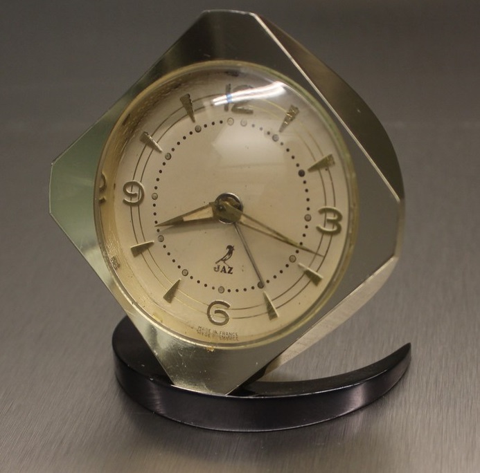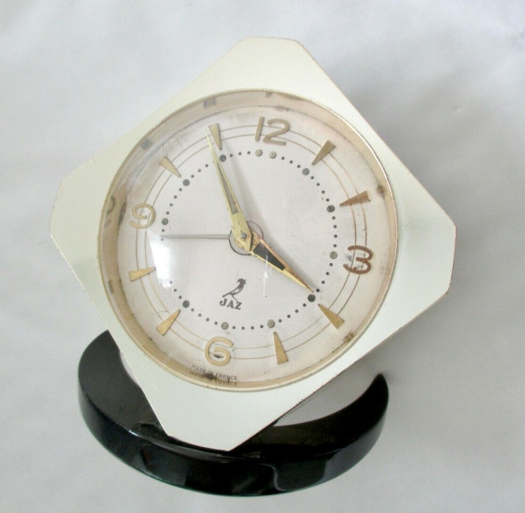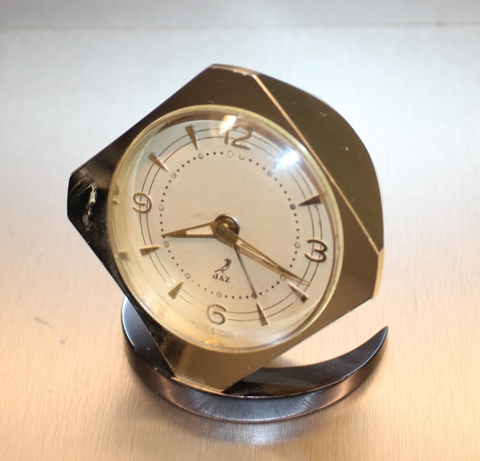 CROSSIC , petit réveil de la gamme des Stylites , mouvement mécanique , calibre J . Nouveauté du catalogue 1959/60 à la page 13 , référence 325-13 . Boîtier façon composé d’un bloc de métal à pans coupés et incurvés vers l’avant ; socle en métal à patine noire « fusil » en forme de croissant de lune ; chiffres et index en reliefs ; aiguilles et points lumineux ; aiguilles dauphines dorées , quatre chiffres cardinaux , mention made in France en bas de cadran , vitre en plexiglas fortement bombée . Format 8 x 8 cm , poids 215 gr .