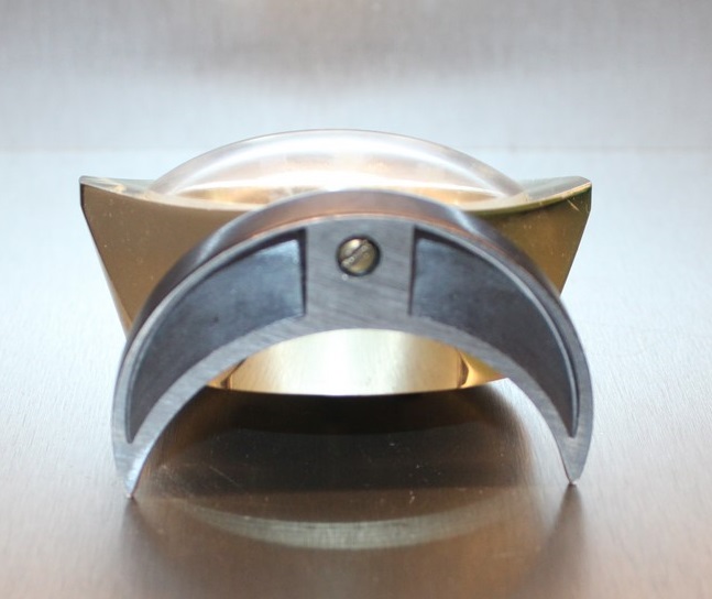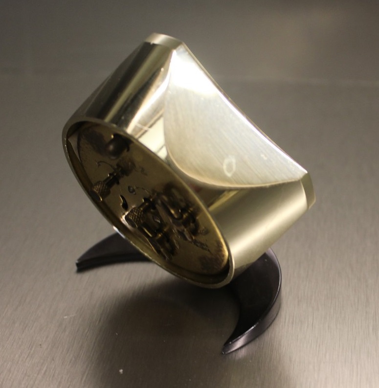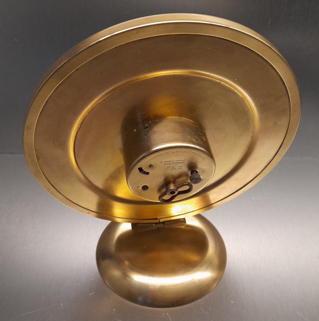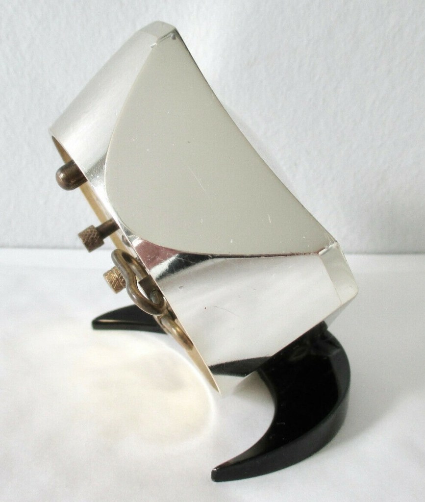 CROSSIC , petit réveil de la gamme des Stylites , mouvement mécanique , calibre J . Nouveauté du catalogue 1959/60 à la page 13 , référence 325-13 . Boîtier façon composé d’un bloc de métal à pans coupés et incurvés vers l’avant ; socle en métal à patine noire « fusil » en forme de croissant de lune ; chiffres et index en reliefs ; aiguilles et points lumineux ; aiguilles dauphines dorées , quatre chiffres cardinaux , mention made in France en bas de cadran , vitre en plexiglas fortement bombée . Format 8 x 8 cm , poids 215 gr .