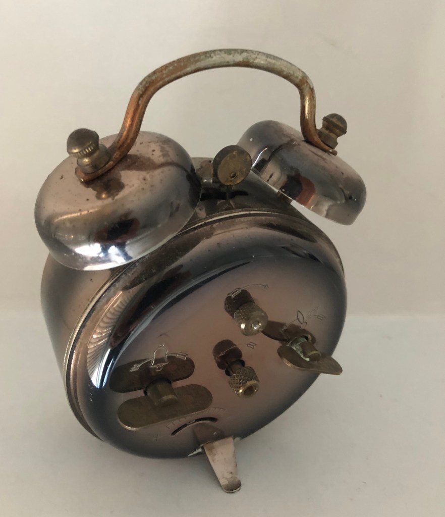 304 réveil mécanique, à sonnerie sur cloches, corps rond en métal, diamètre 80 mm, existe en blanc , bleu, crème, rouge et cuivre, présents au catalogue espagnol 1981/1982, made in Spain , non commercialisé en France