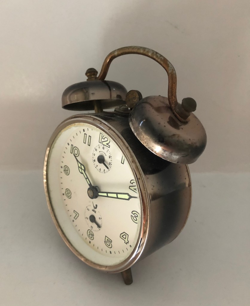 G2370 réveil rond en cuivre , à cloches , bélière , mouvement mécanique à répétition de sonnerie , arrêt de sonnerie au sommet , aiguilles et points lumineux , chiffres romains , arrêt de sonnerie au sommet , référencé G2370 à la page 19 du catalogue Jaz 2000 , poids 473 gr , diamètre 95 mm