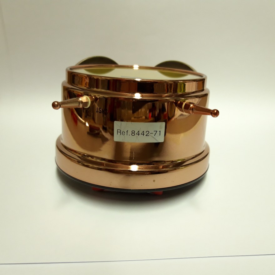 CIVRIC , réveil de la gamme des Gros Jaz , mouvement mécanique à répétition , calibre PA made in Germany . Nouveauté du catalogue 1982 à la page 41 , référencé 1251-61 . Boîtier et cloches en cuivre rouge , sonnerie sur deux clochettes reliées par une grande bélière , cadran doré , aiguilles et points lumineux . Diamètre arrière 12,5 cm , diamètre de la vitre 10 cm , poids 395 gr .