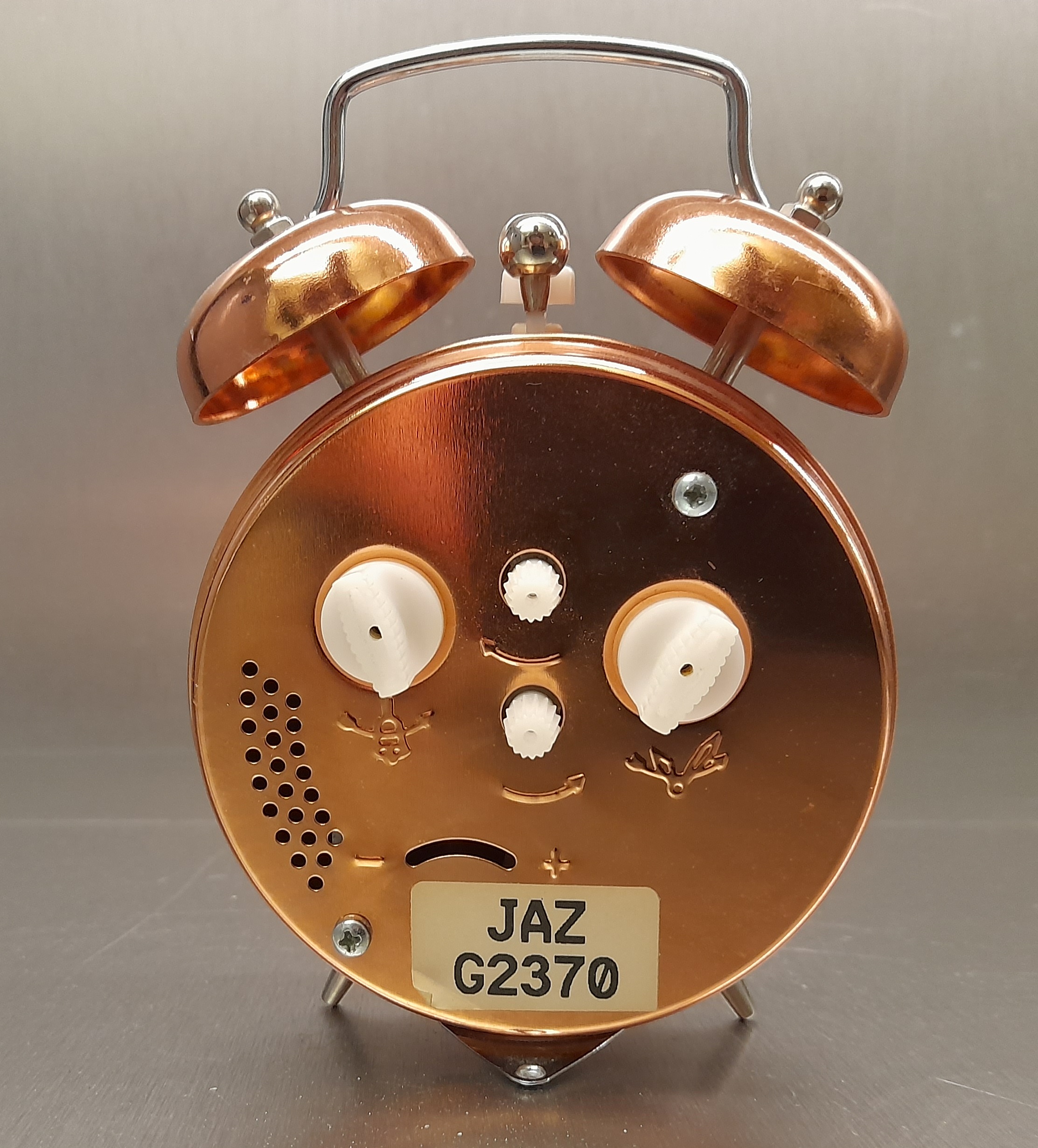 CLOVIC , gros réveil , Jaz Quartz , mouvement électrique à quartz , à pile LR6. Exclusivité du catalogue 1982-83 à la page 11 , référencée 8442-71 . Boîtier en cuivre rouge surmonté de 2 cloches , bélière , aiguilles et chiffres lumineux , trotteuse centrale . Diamètre 10,5 cm.