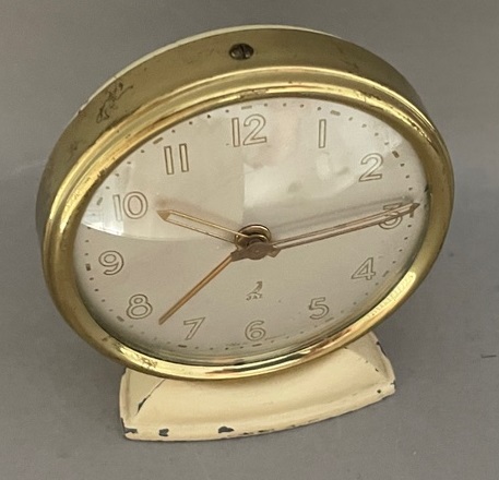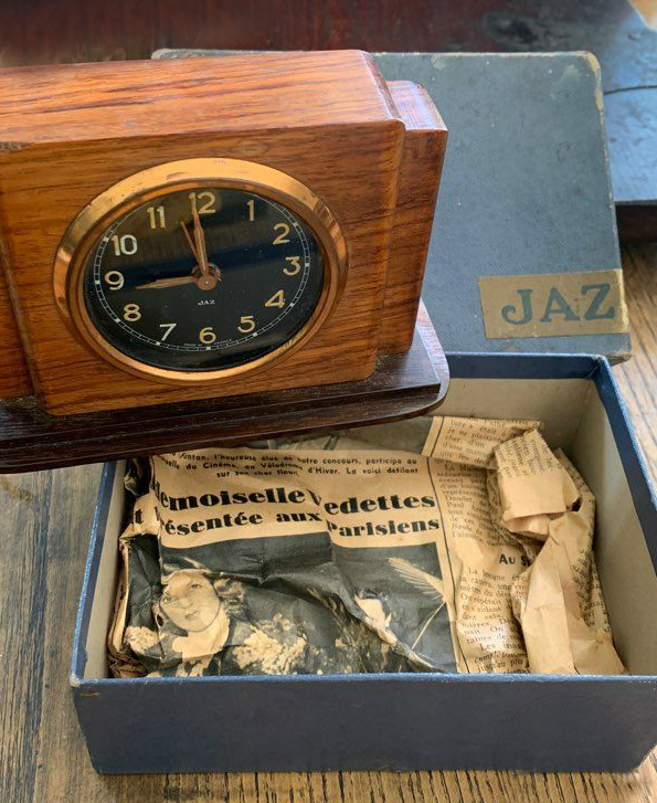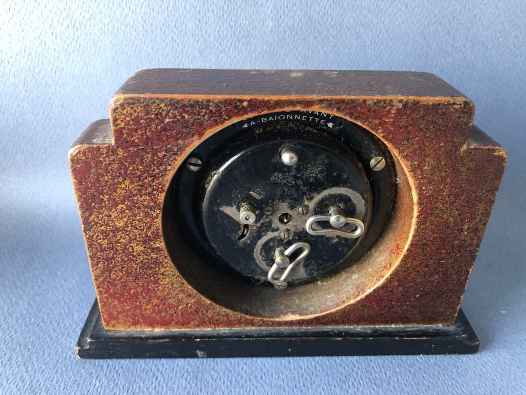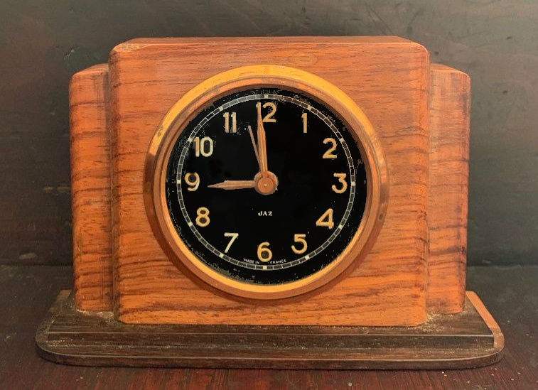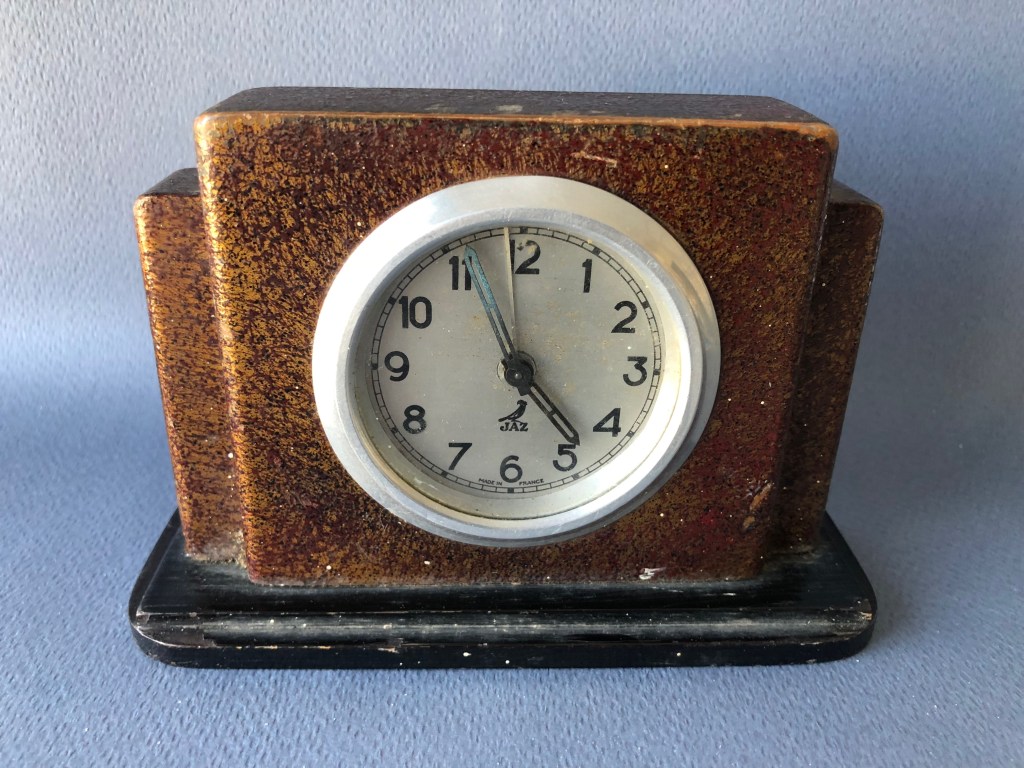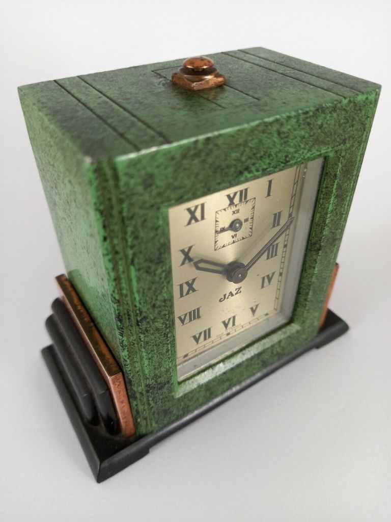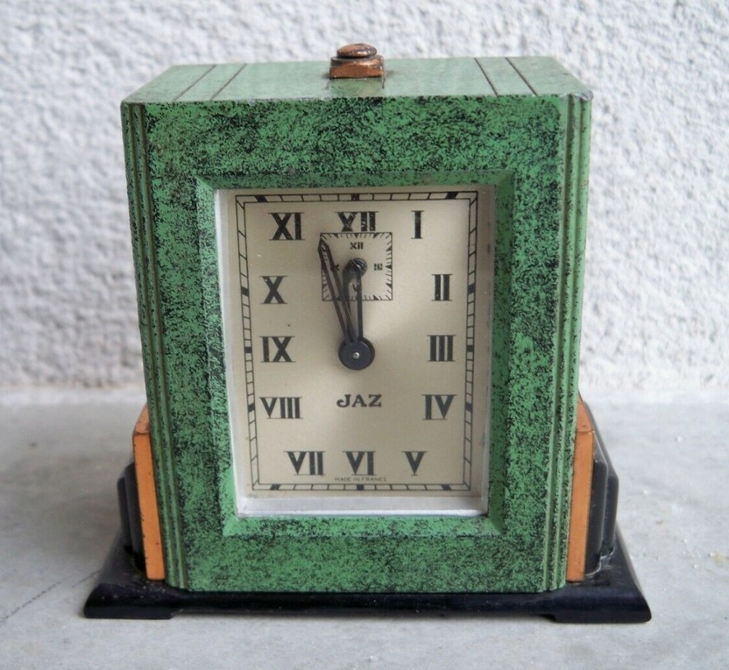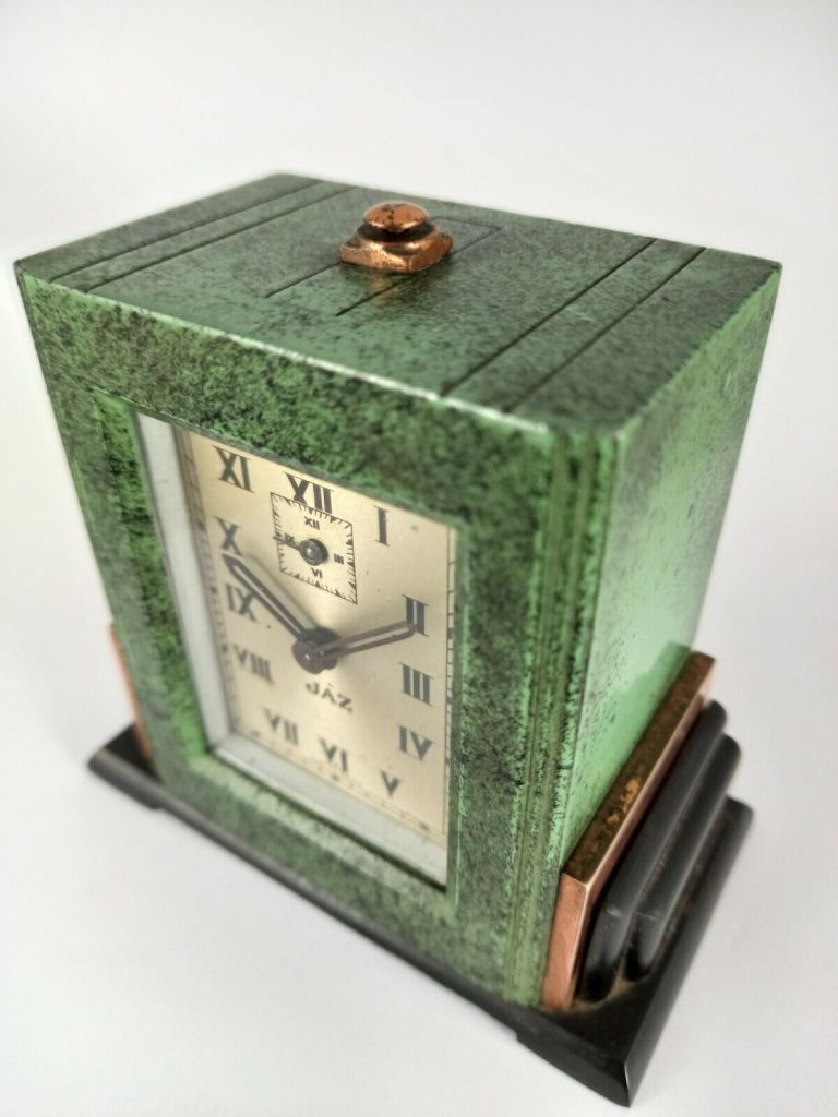 VERDIC , petit réveil mécanique, gamme « les petits calibres » . D’une fabrication très soignée, les petits réveils JAZ , 30 heures , calibre E possèdent des pignons taillés , trempés , polis ; des platines pleines ; un porte-échappement et des barillets indépendants , un échappement empierré . Référencé 341-20 sans écrin et 0341-20 avec écrin , dans le catalogue de Janvier 1942 à la page 7 . Ses références deviennent 341-10 et 0341-10 dans le catalogue 1943 peut être parce que le boîtier est désormais métal marbré . Il n’est plus au catalogue en 1945 . Cage moulée en métal , émaillée chinée , base en Jazolite noire avec ornements cuivre rouge , chemin de fer au pourtour du cadran , cadran métal teinté champagne , mention Made in France en bas de cadran , chiffres romains , aiguilles glaives , non-lumineux . Format 9 x 8,5 cm , poids 585 gr . Inutile de chercher plus loin que sa couleur pour l’origine de son nom . Modèle à cheval sur deux périodes de la chronologie des logos Jaz , on le trouve avec les deux types d’estampille au cadran , avec ou sans jaseur .