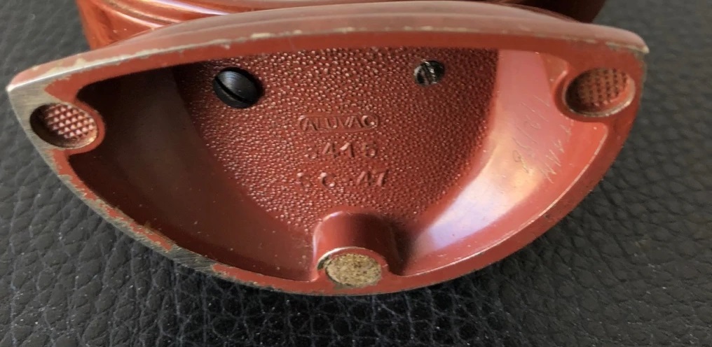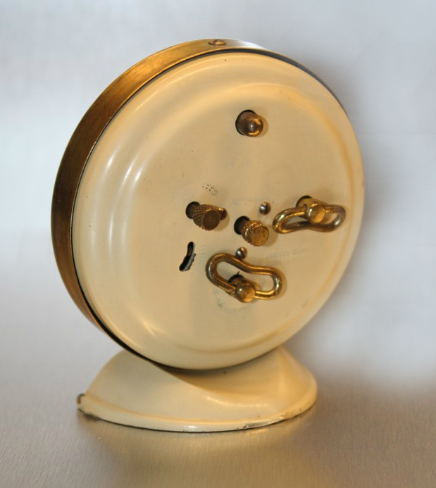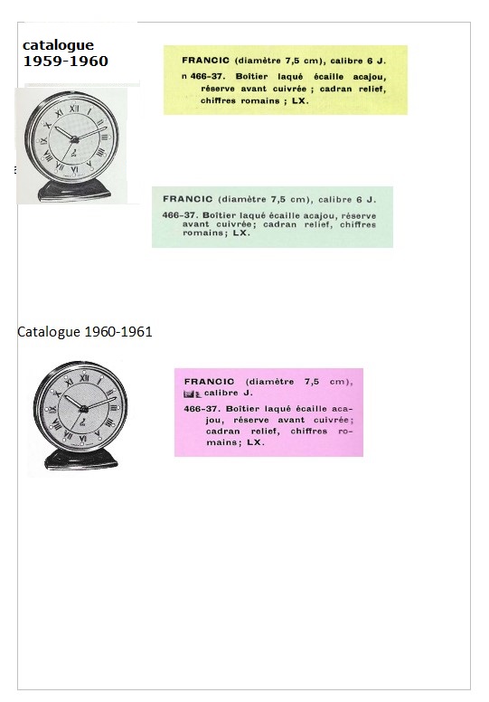 Il est tout d’abord proposé en 1950 avec un boîtier doré brillant , un socle et la cloche arrière laqués ivoire , réf . 466-10 pour la version Lx et 466-11 pour la version NL. En 1951 un écrin en fer à cheval est proposé en option . En 1953 la version non lumineuse 466-11 n’est plus en vente , en revanche apparaît une version supplémentaire à boîtier et socle de couleur écaille acajou , réf 466-37 , ils disposent toujours de l’écrin fer à cheval en option mais maintenant au choix avec un écrin chapelle . En 1955 , le tout premier modèle doré réf . 466-10 n’est plus disponible , la version écaille acajou réf. 466-37 est toujours en vente et on lui ajoute une version à chiffres arabes et l’ensemble socle et boîtier peint de couleur ivoire , réf 466-19 qui peuvent encore être dotés d’un écrin fer à cheval ou chapelle . Pas de changement en 1956 , en revanche en 1957 la version ivoire réf. 466-19 disparaît ainsi que les écrins qui ne sont plus disponibles . Seule la version acajou réf.466-37 est toujours en vente dans les catalogues 1957 , 1958/59 , 1959/60 et enfin 1960/61 pour la dernière apparition du FRANCIC. Socle du FRANCIC en aluminium moulé estampillé ALUVAC en relief. Après la Grande Guerre , Ferdinand de Vazeilles Directeur du Laboratoire et des Ateliers Thermique des Automobiles , chargé par le Ministère de l’Armement d’une mission en Angleterre , découvre l’existence de la technique peu usité de la fonderie d’aluminium sous pression . En 1919 il crée la première fonderie française sous pression à Paris qu’il transfère à Nanterre en 1925 et baptise ALUVAC , fonderie de précision .. Il connaît un succès foudroyant en fournissant tout d’abord l’industrie automobile avec les premiers carters fondus sous pression mais si cette marque et Monsieur de Vaizelles restent célèbres de nos jours , c’est parce qu’il réalise les premiers jouets exploitant ce procédé pour des petites voitures qu’il décide de commercialiser lui même sous le nom de SOLIDO .