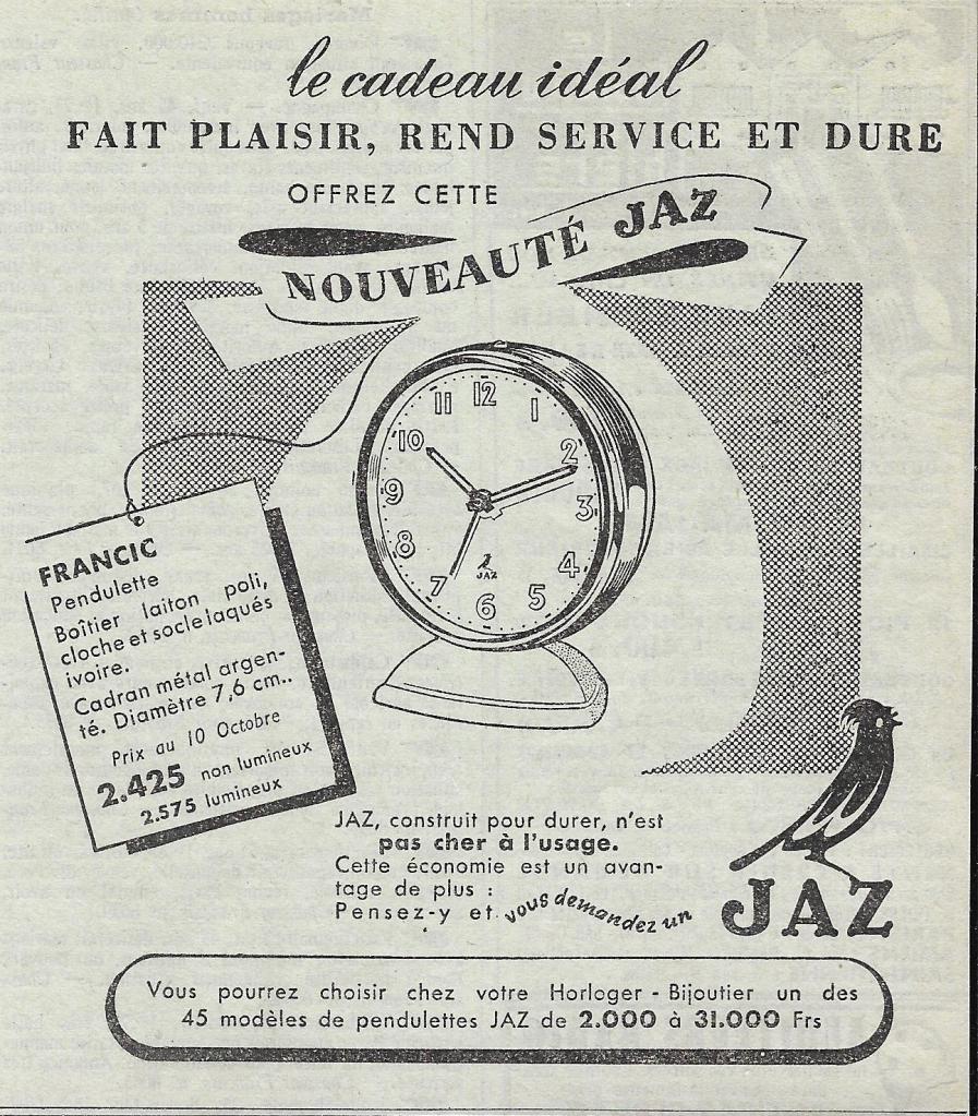 Affichette de vitrine fournie aux horloges affiliés avec la Jazette de Novembre 1950