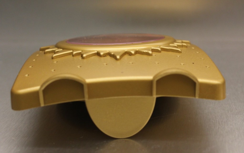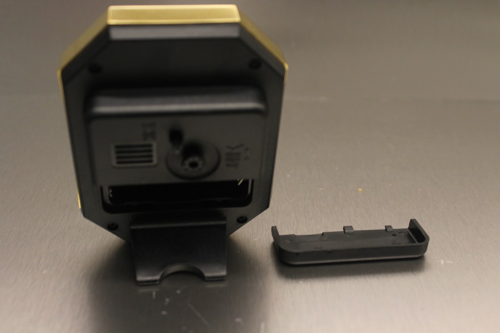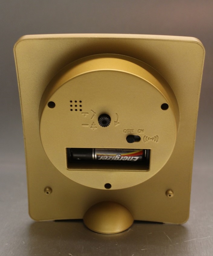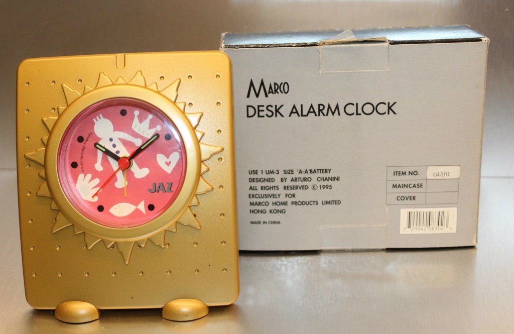 Docteur GLUBE, réveil, corps en plastique doré , nouveauté du catalogue 1997/1998 page 19, version dorée référencée G4801, pas de chiffres, aiguilles lumineuses, à pile LR6, trotteuse centrale rouge, format 14,6 x 12 x 6 cm, poids 160 gr sans la pile. La trappe de pile n’est pas absente , ces modèles Docteur GLUBE n’en comportaient pas . Marco Home Products Limited est une entreprise hongkongaise, fondée en 1990, qui produit des produits de maison de haute qualité avec un design contemporain: des ustensiles de cuisine aux minuteurs. Le design de ce réveil est attribué à Arturo Chanini qui semble être une entité fictive recouvrant un bureau de stylisme. Voir la version grise ou bleue marine .