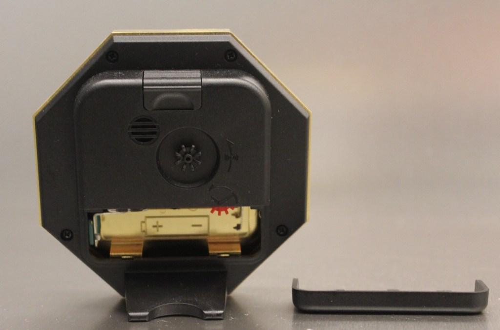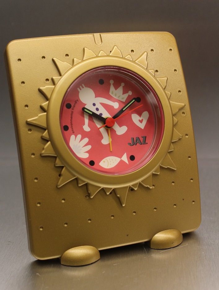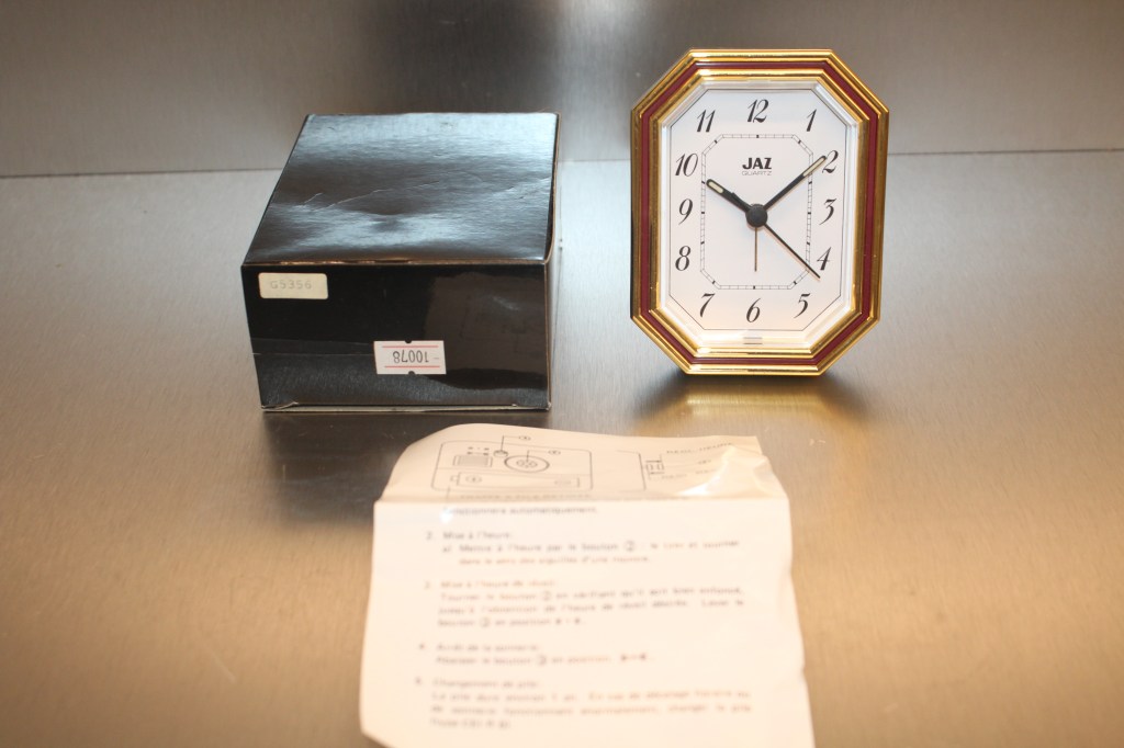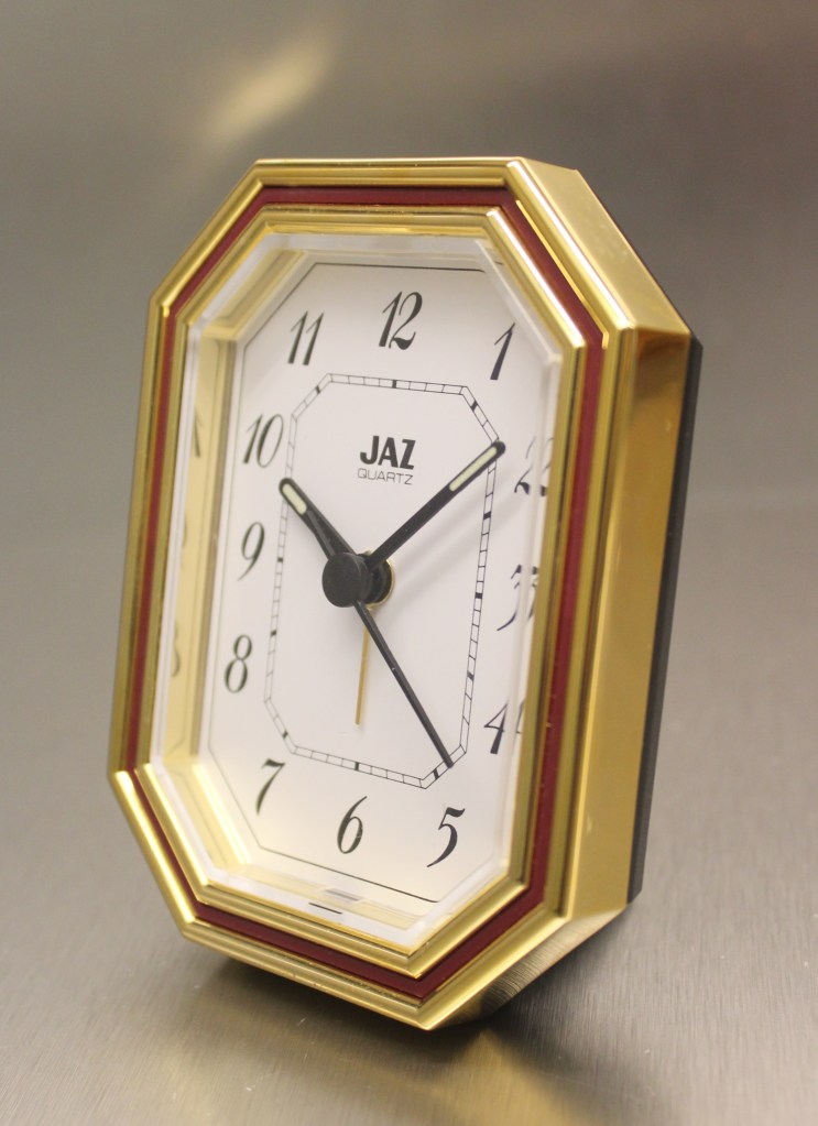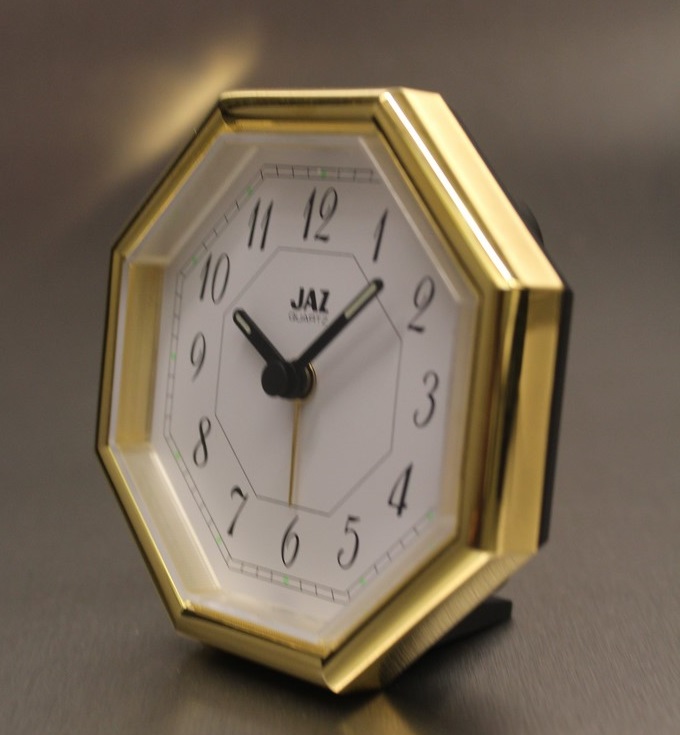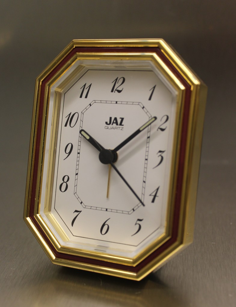 G5356 , petit réveil Jaz quartz , corps octogonal en plastique doré à liseré doré , mouvement quartz à pile LR6 , arrêt de sonnerie au dos , chemin de fer octogonal à l’intérieur de la zone des chiffres , aiguilles noires en plastique , chiffres Breguet , trotteuse centrale noire , hauteur 10,3 cm , largeur 7,6 cm , poids 100 gr sans la pile , boîte d’origine sans logo Jaz . Nouveauté du catalogue 1993/1994 page 30 . Disponible aussi jusqu’au catalogue 2000.