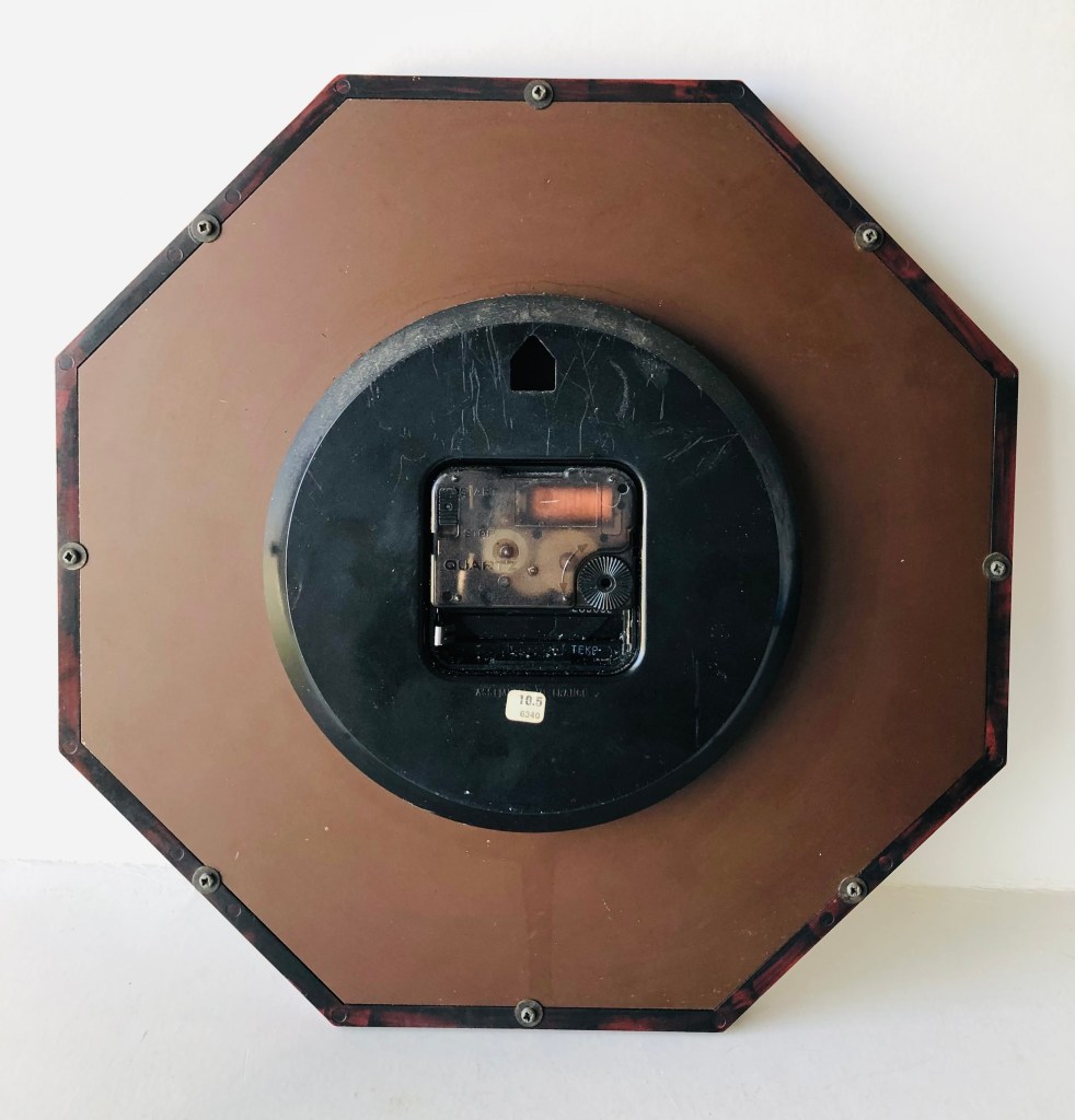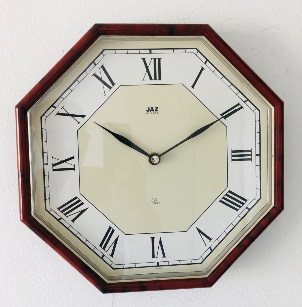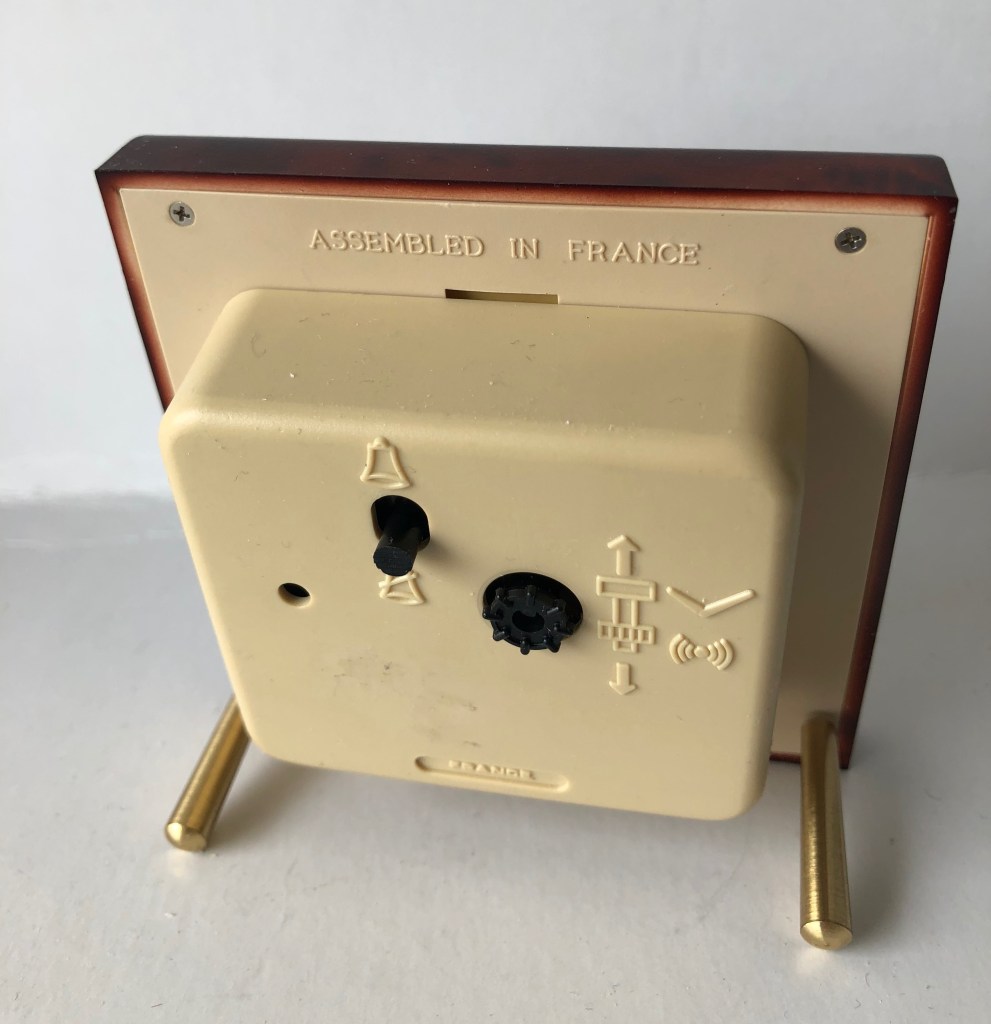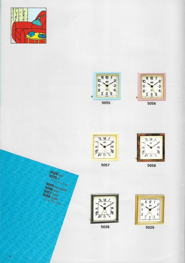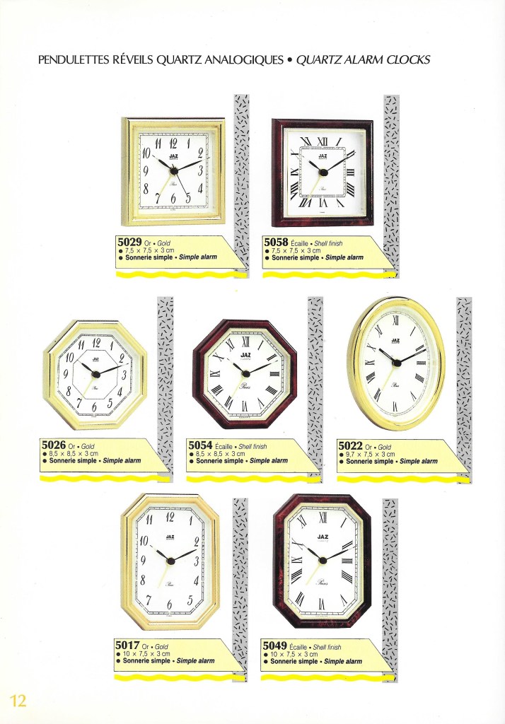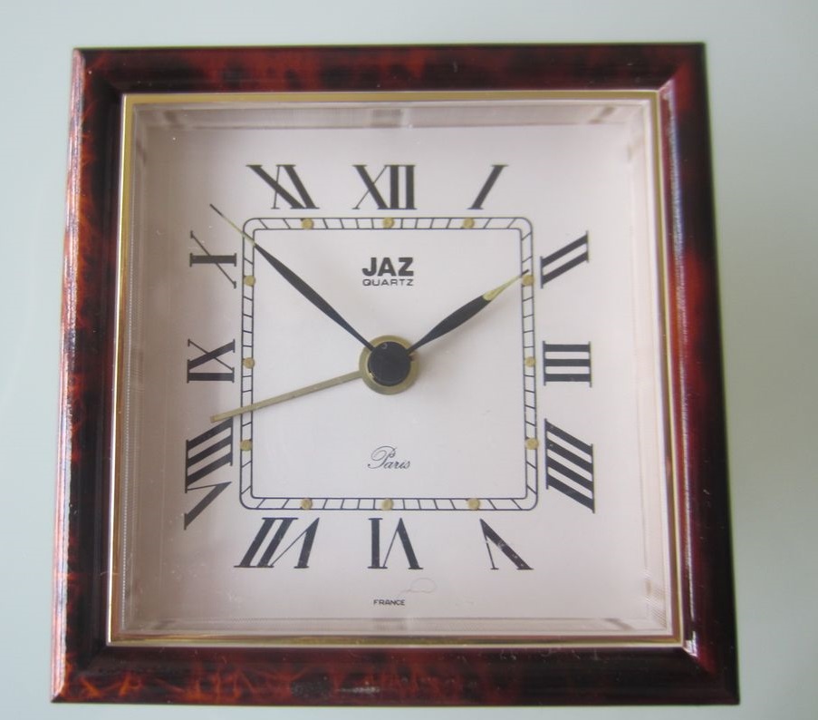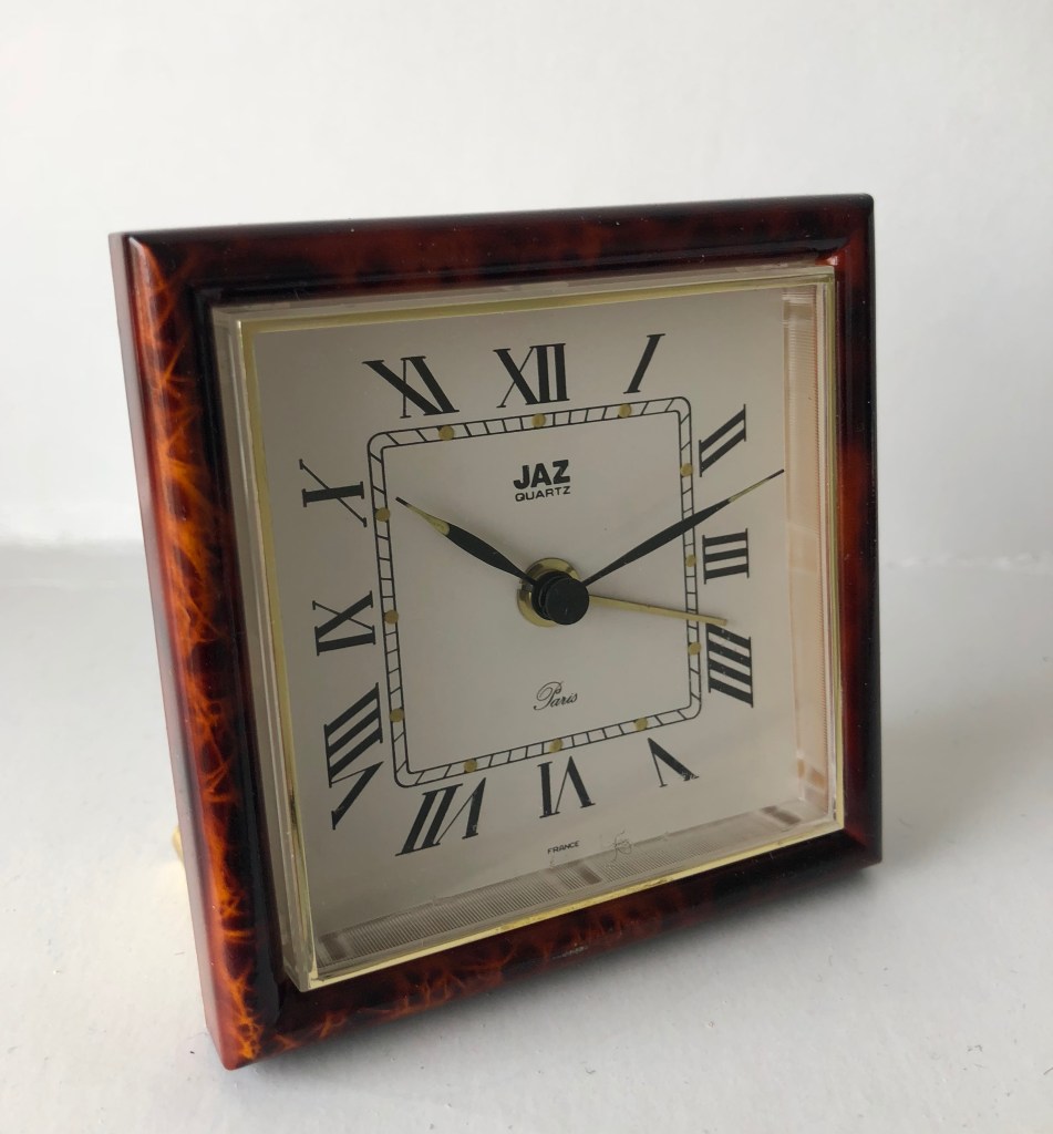 5049 petit réveil de la gamme des Jaz Paris et Jaz Quartz, mouvement quartz à pile LR6 . Corps octogonal en plastique de couleur écaille pour le cadre, chiffres romains , chemin de fer octogonal au pourtour du cadran, mentions Paris et France au cadran , aiguilles noires poire et feuille lumineuses . Format: 10 x 7,5 x 3 cm. Poids: 75 gr. Nouveauté du catalogue 1986 page 15 disponible jusqu’en 1989