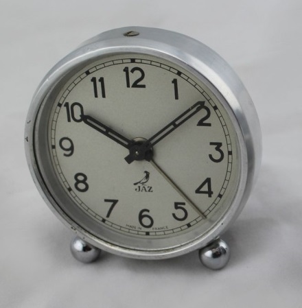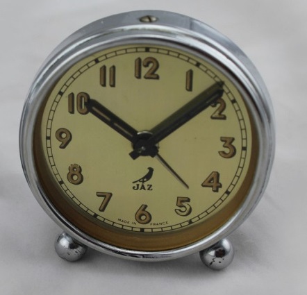 CUBIC , petit réveil de Luxe , mouvement mécanique , daté en creux 1931 sur la platine du calibre E . Le CUBIC a été disponible aux catalogues Jaz de 1929 à 1936 dans diverses versions : Consultez notre galerie photo des variantes de CUBIC