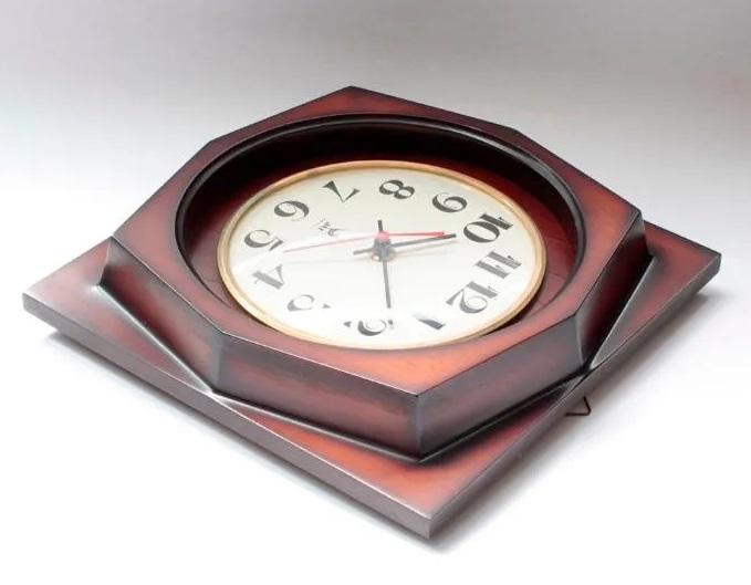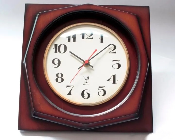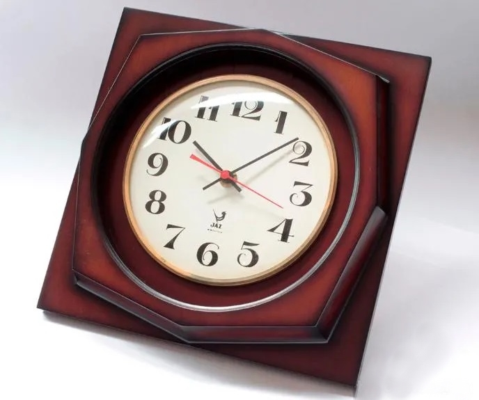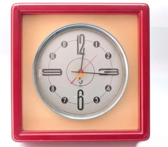 993 , Jaz Electrico, horloge murale, corps en bois teinté , forme carrée , calibre TM , à pile LR14, trotteuse centrale rouge , aiguilles noires , format 26 x 26 cm , épaisseur 6 cm . hors catalogue France, présente au catalogue Jaz espagnol de 1981/1982 référencée 993 , uniquement export Espagne.