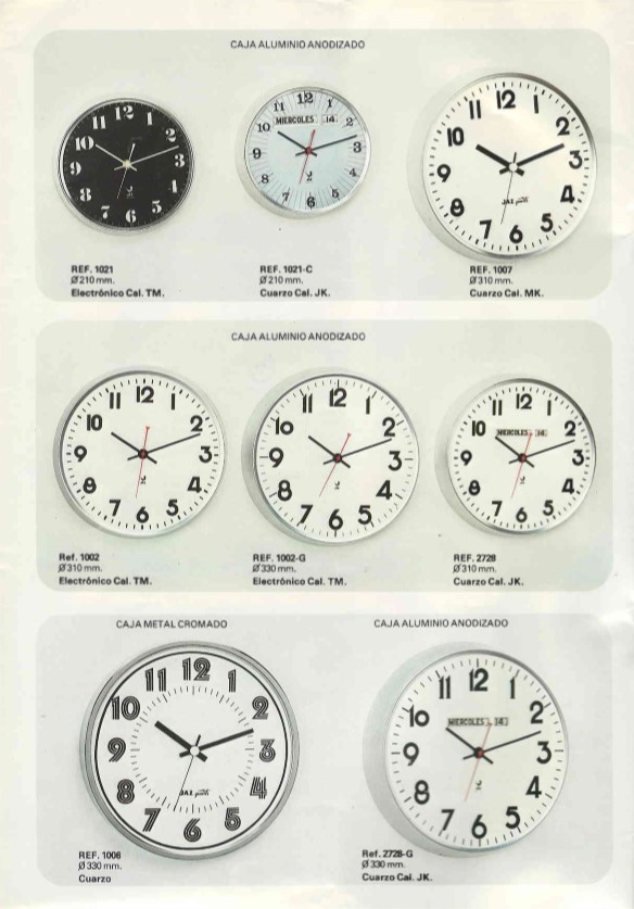 Jaz Electrico, horloge murale, corps en plastique bleu marine, trotteuse centrale rouge, aiguilles noires, calibre TM à pile LR14 diamètre 20 ,5 cm . Hors catalogue France, présente au catalogue espagnol 1981/1982 à la page 3, export uniquement, Espagne.