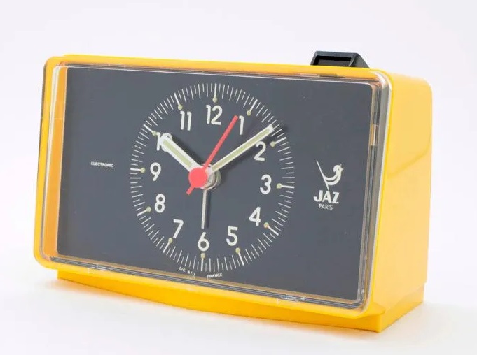 Réveil , type CHARMIC , gamme Jaz Paris et gamme Electronic , licence ATO , mention France , export Espagne , à pile LR14 , cadran noir , aiguilles et points lumineux , plastique jaune , arrêt de sonnerie au sommet . Format 10.4 X 6.7 cm. L’étiquette, qui se trouve dans le logement des piles , confirme ce que l’aspect extérieur indique : une appartenance à la gamme des CHARMIC puisque le suffixe 444 est celui des CHARMIC , la date 07/9 juillet 1979 correspond à celle de la production de ces modèles . Toutefois à l’export, les Jaz ne conservent pas leur dénomination en-IC .