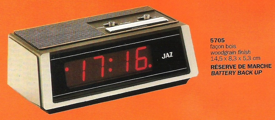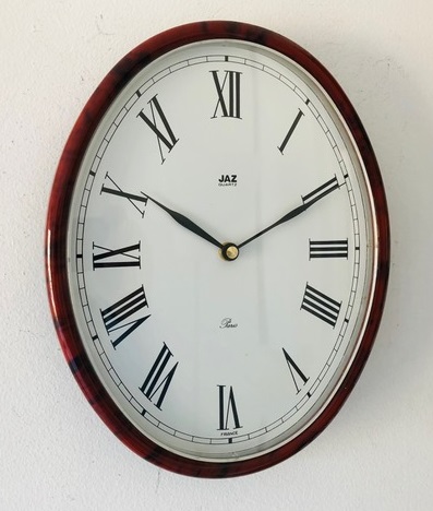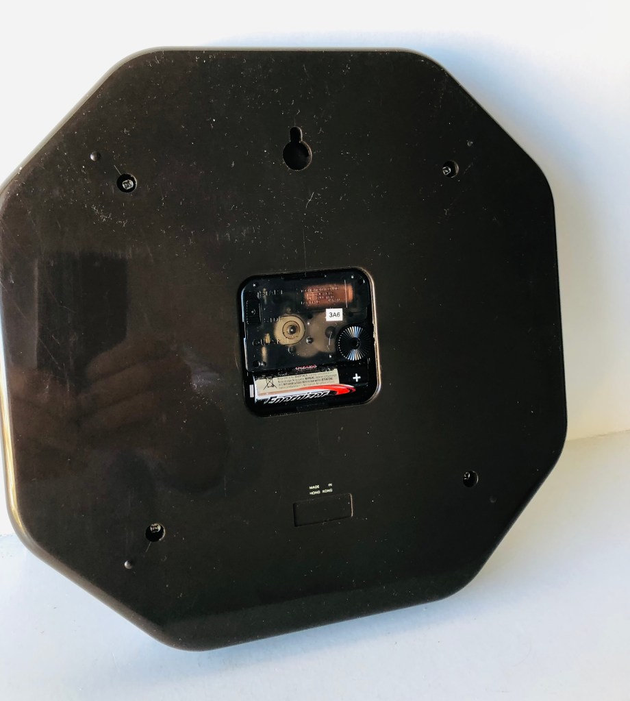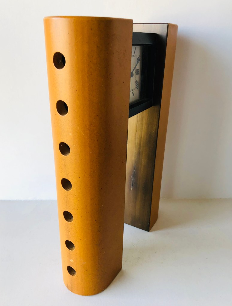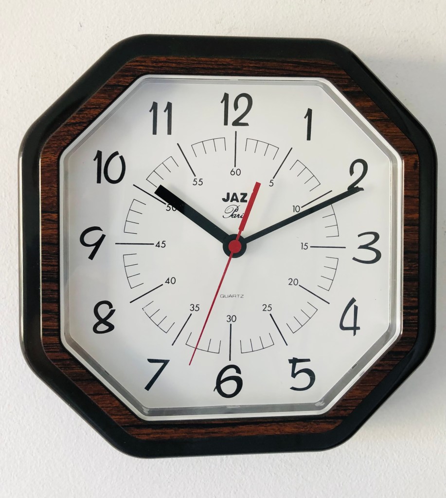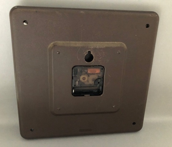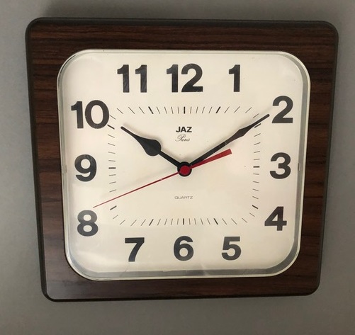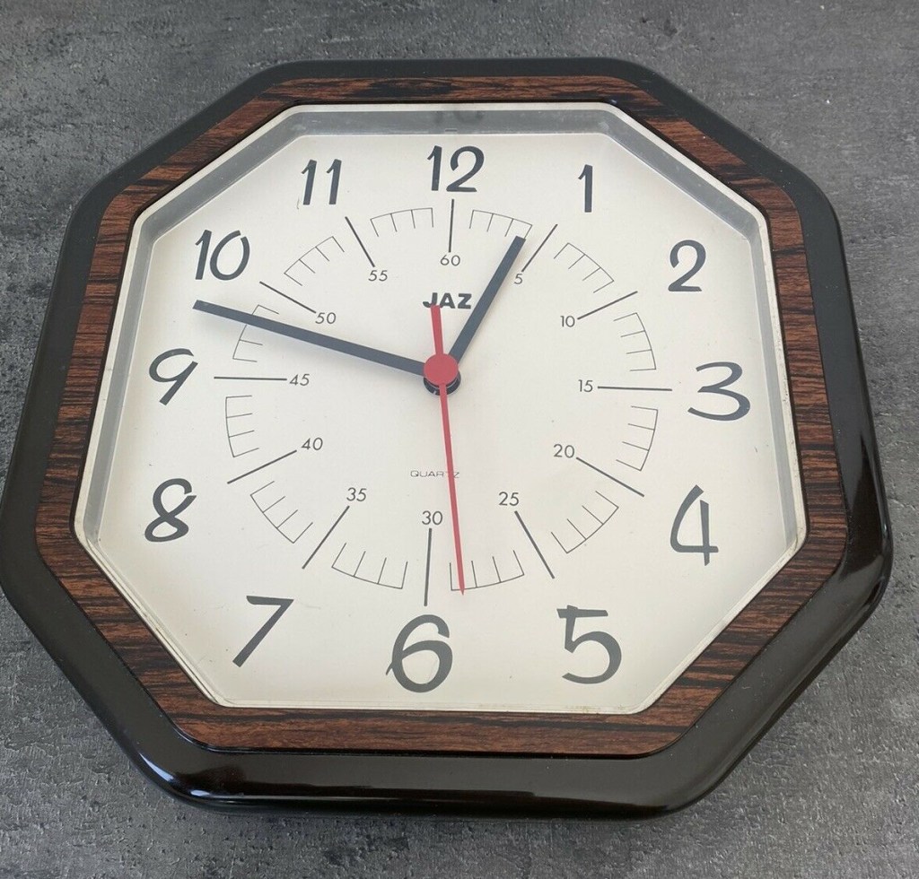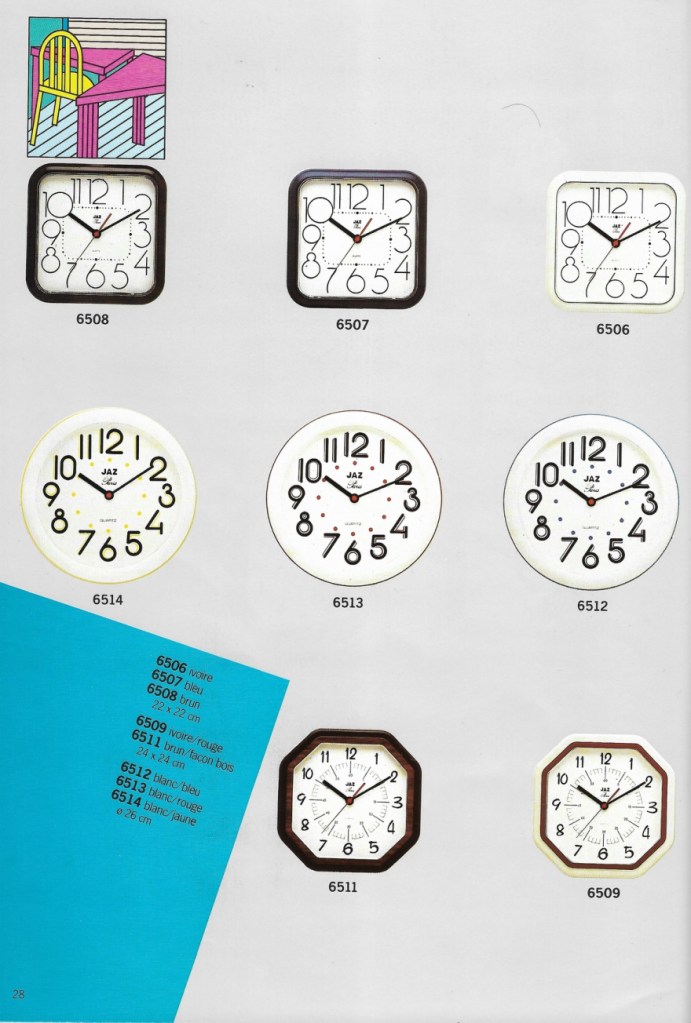 7219 horloge murale, à dateur date et jour, mouvement quartz à pile LR6, chiffres romains sur cadran émaillé, trotteuse centrale noire, forme octogonale en bois composite façon noyer de couleur brune et non pas noir contrairement à la photo du catalogue, présente uniquement au catalogue 1993/94 à la page 59. Format: 25 x 25 cm.